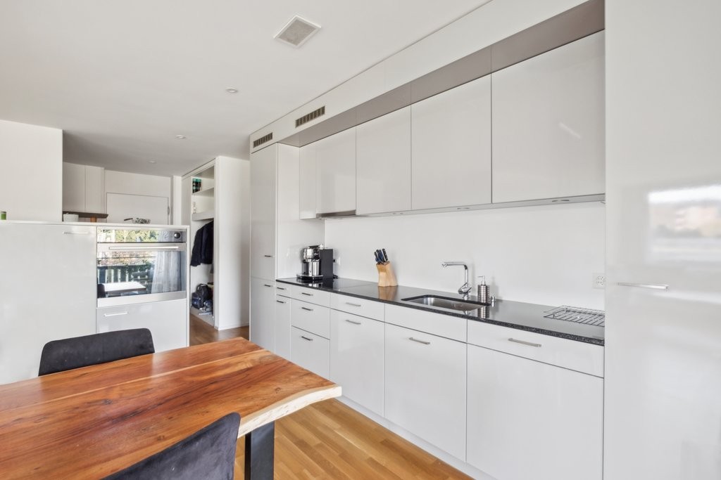 - Offene Küche, Glaskeramikherd, Geschirrspüler, Backofen auf Sichthöhe, Kühlschrank mit separatem Tiefkühler und genügend Stauraum