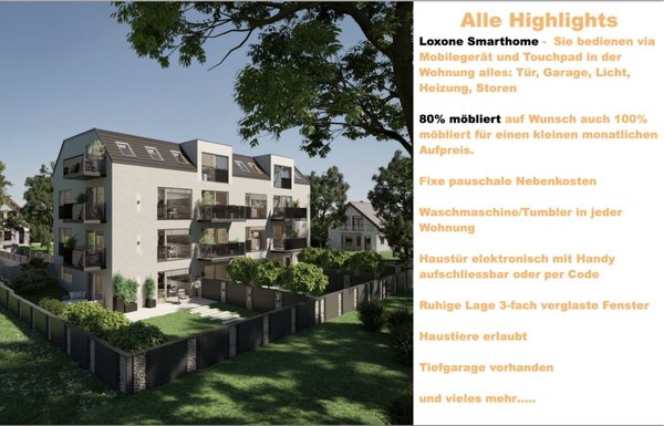Hier fühlen Sie sich wie im 5 Sterne Hotel. Fast das komplette Mobiliar wird standartmässig in jeder Wohnung verbaut. MIt dem Lift gelangen Sie in jede Etage und die Gartenwohnungen sind alle auch direkt durch den Garten zu erreichen. Storen, Licht, Heizung usw. ist alles mit dem Smartphone zu bedienen, dank der Smarthomefunktion von LOXONE.