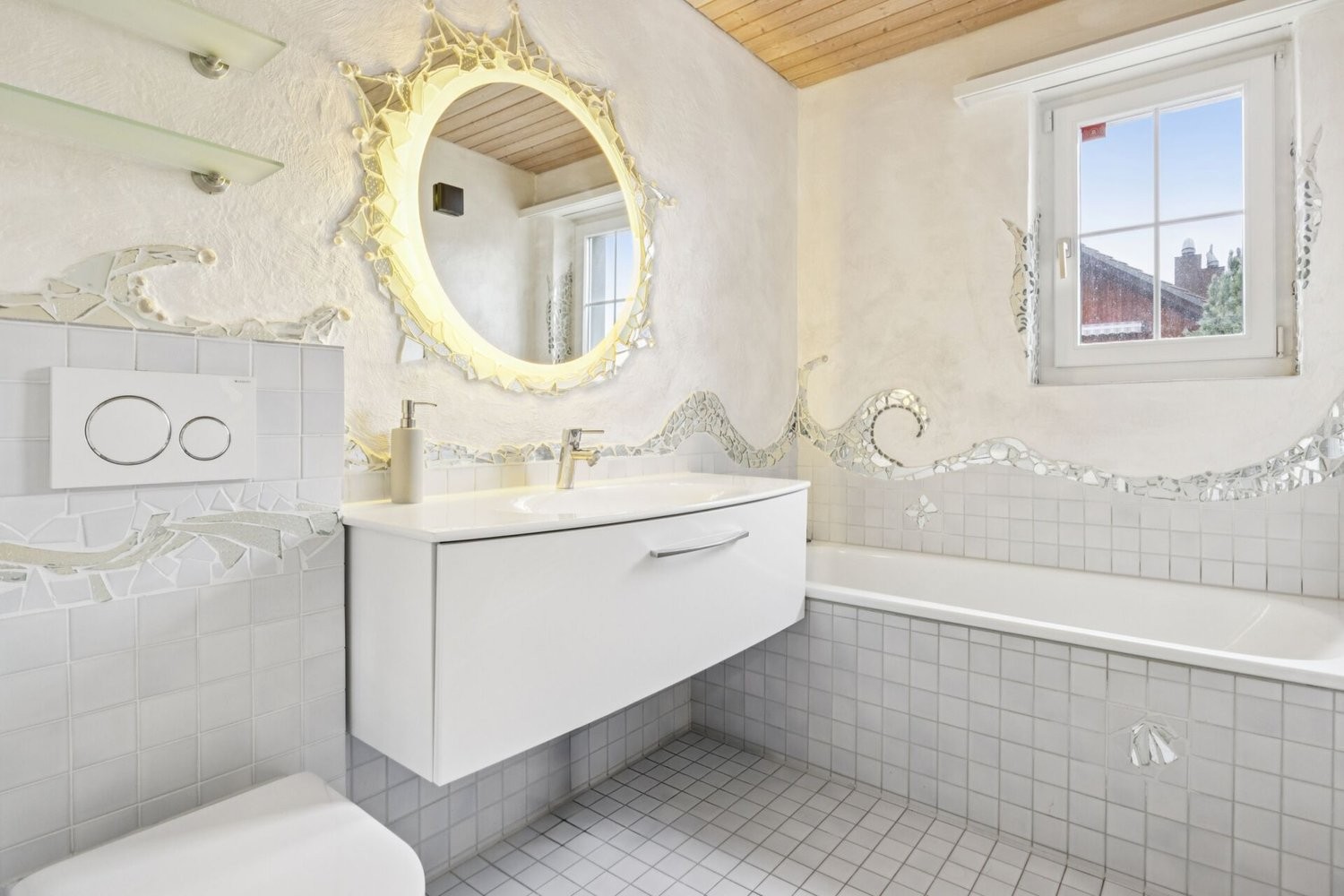 Vier Zimmer unterschiedlicher Grösse gewähren vielseitige Nutzungsmöglichkeiten, ob als Rückzugsort, Büro oder Kinderzimmer. Zwei Nasszellen erhöhen den Wohnkomfort, eines davon mit Badewanne, das andere mit einer Duschkabine. Über eine elegante Treppe gelangen Sie auf die offene Galerie, die sich hervorragend als Arbeits- oder Lesezone eignet und dank Dachfenstern viel Tageslicht erhält.