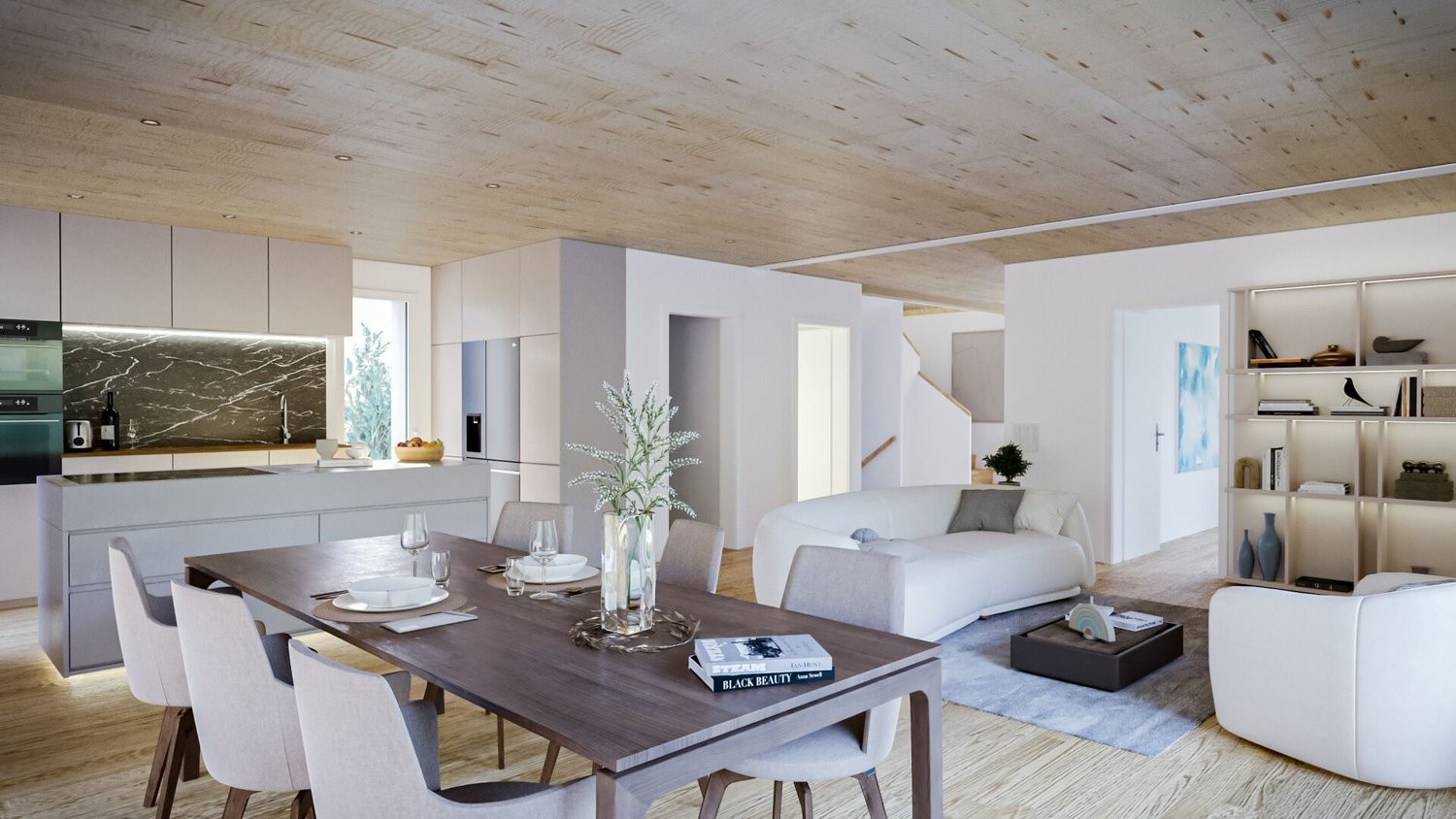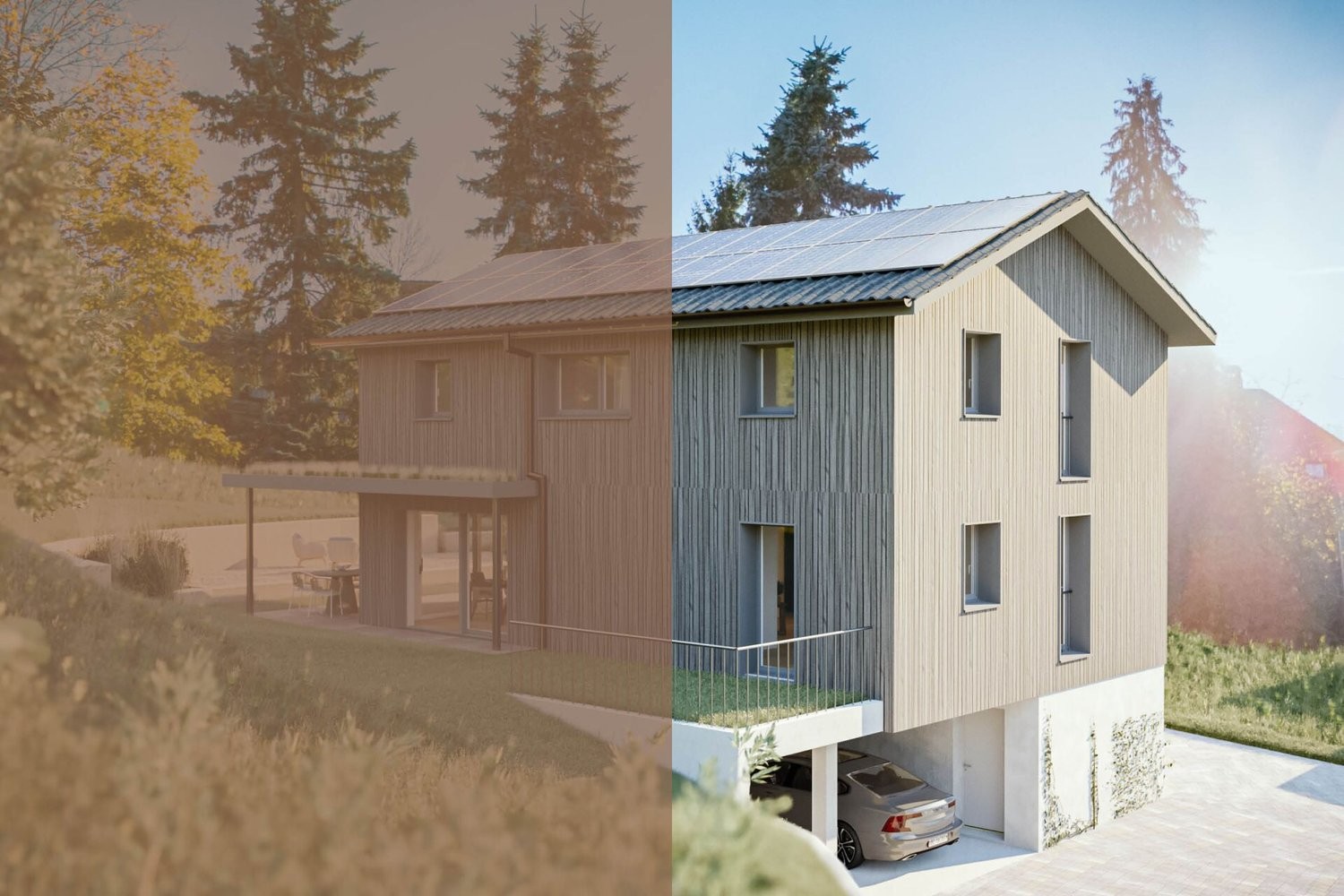 Am Tandliweg 6 und 8 in Fräschels entsteht ein hochwertiges Neubauprojekt mit zwei modernen Einfamilienhäusern, das durch zeitgemässe Architektur und nachhaltige Holzelementbauweise überzeugt. Die ruhige, sonnige Lage am Dorfrand verbindet naturnahes Wohnen mit guter Erreichbarkeit. Grosse Fensterflächen, eine warme Holzfassade und ein offenes Innenraumkonzept schaffen helle, einladende Wohnbereiche. Im Erdgeschoss sorgen Wohn- und Essbereich für ein harmonisches Raumgefühl, während eine Terrasse für einen natürlichen Übergang ins Freie sorgt. Ein Zimmer, welches sich ideal für Hobby, Fitness oder Büro eignet, rundet das Erdgeschoss ab. Im Obergeschoss bieten drei Schlafzimmer und zwei elegante Bäder viel Komfort. Das Untergeschoss stellt zusätzliche Nutzflächen bereit. Moderne Haustechnik wie Wärmepumpe, Fussbodenheizung und Photovoltaikanlage garantieren energieeffizientes und komfortables Wohnen.