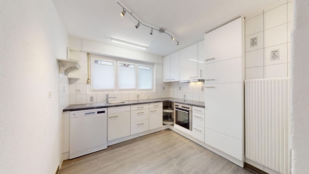 - Die Küche mit weissen Fronten und dunkler Arbeitsplatte bietet genügend Stauraum