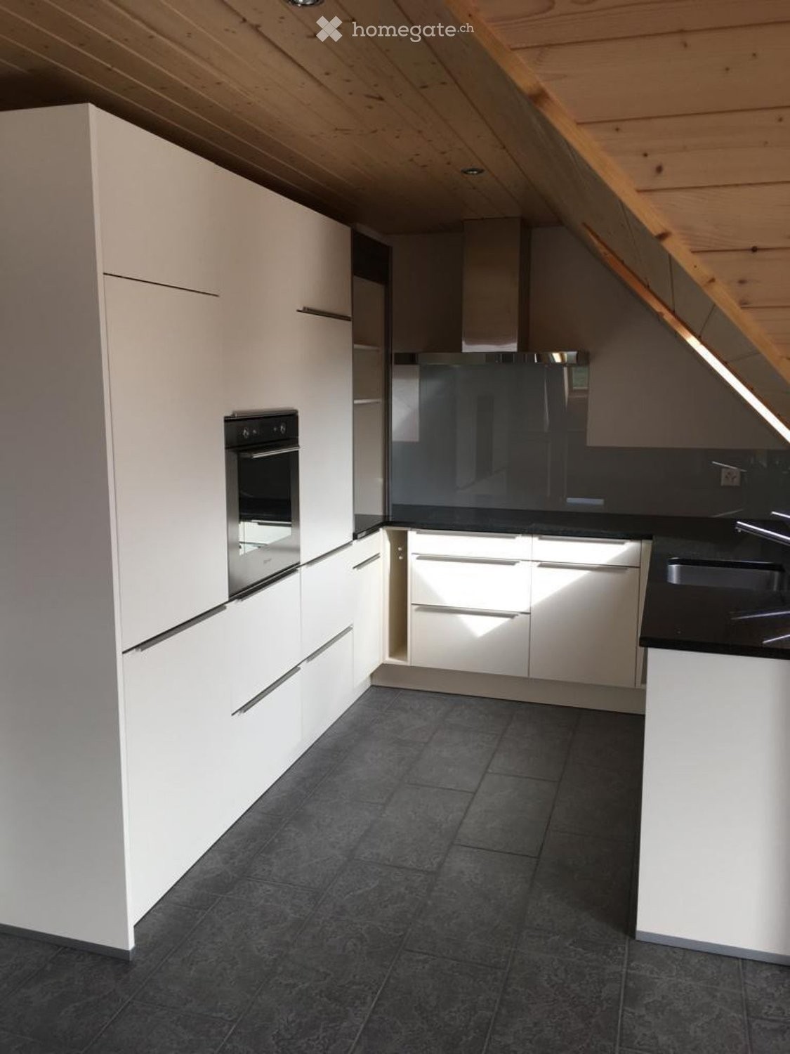 Wohnzimmer mit Laminatboden, Wohnküche mit Plattenboden, Küche GS, Glaskeramikherd und Steinabdeckung