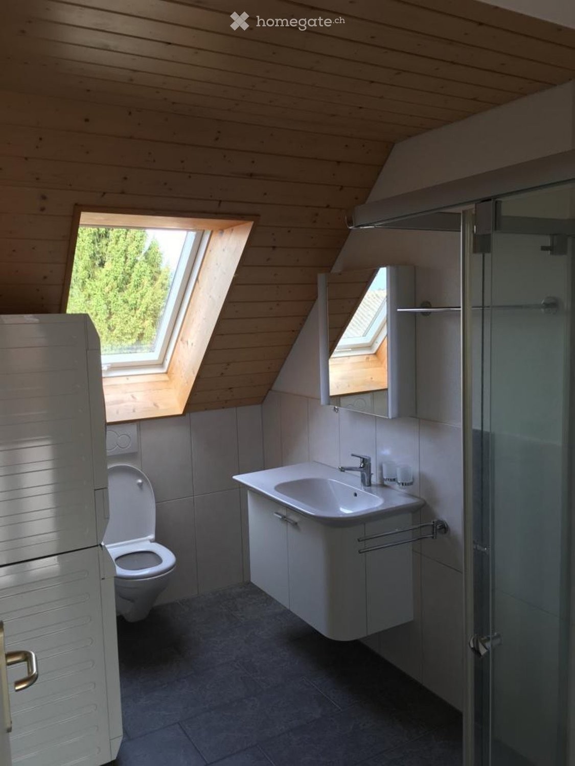Badezimmer: WC, Dusche, WM, Tumbler, Plattenboden