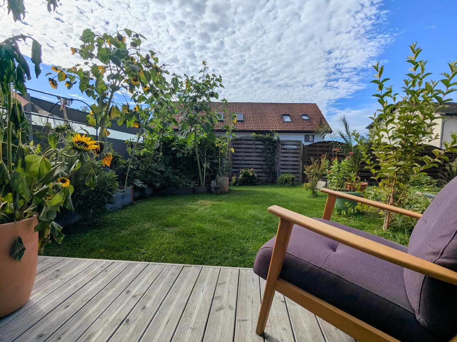 Herziger Garten mit Holzdeck auf der Südseite