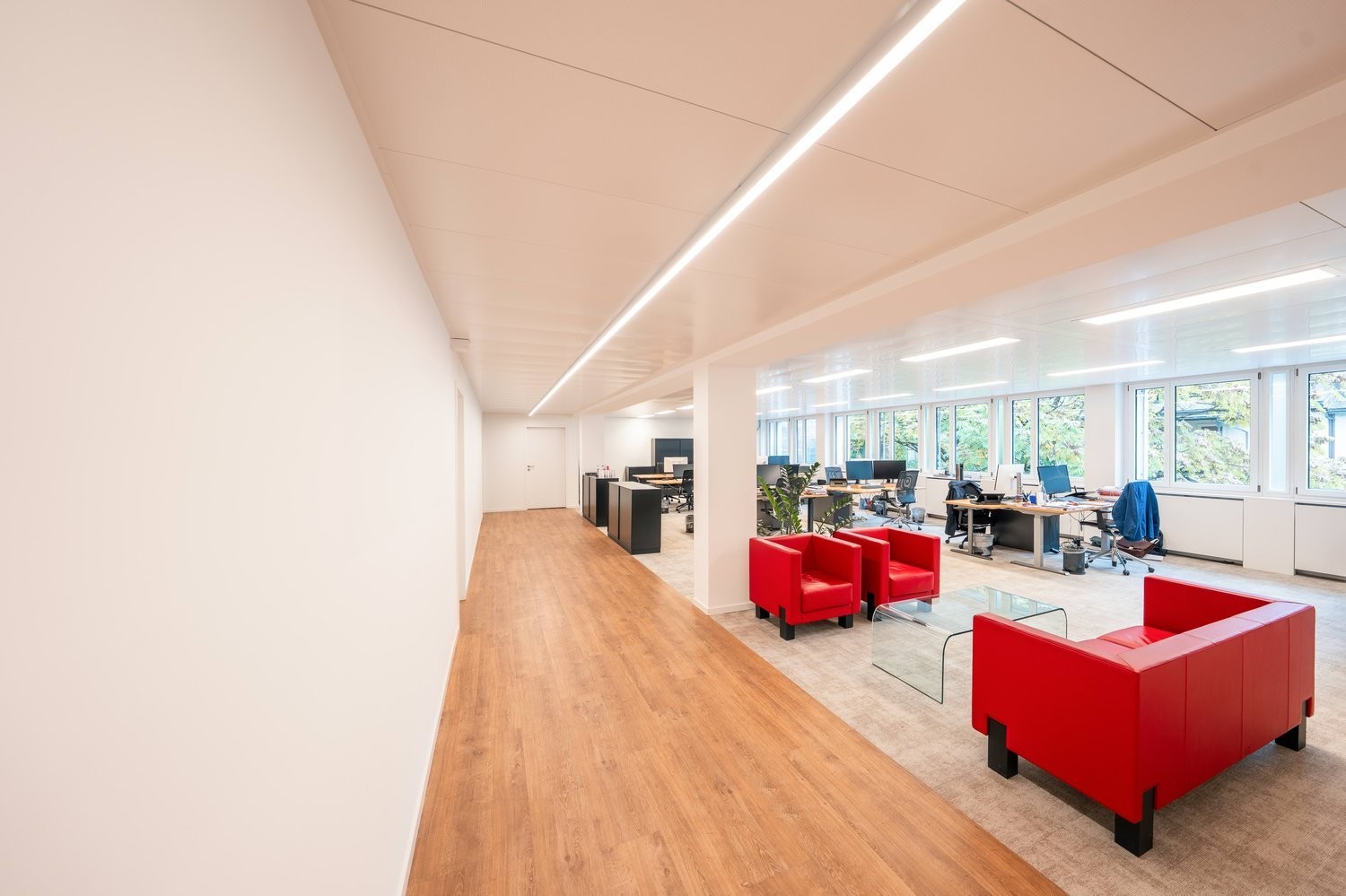 Dank der grossen Fensterflächen profitieren die Räumlichkeiten von viel Tageslicht und einer angenehmen Arbeitsatmosphäre.