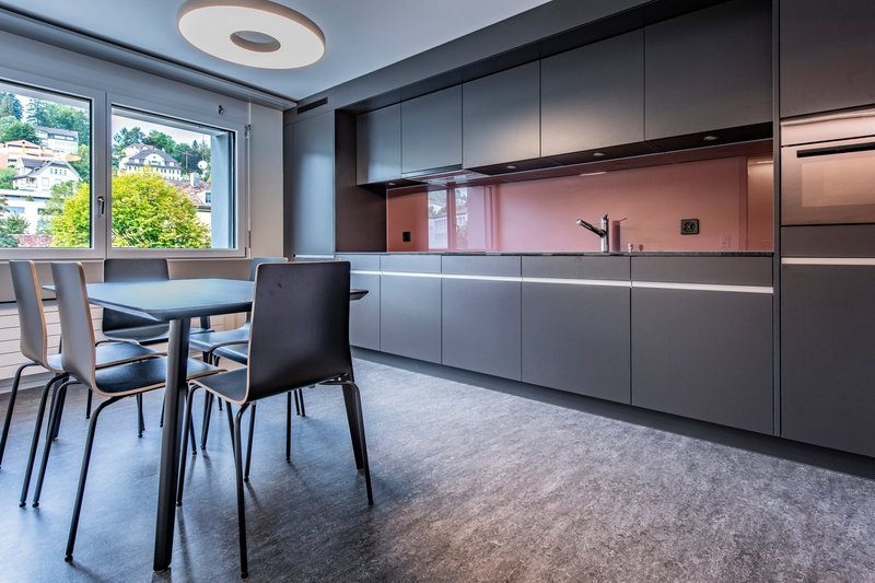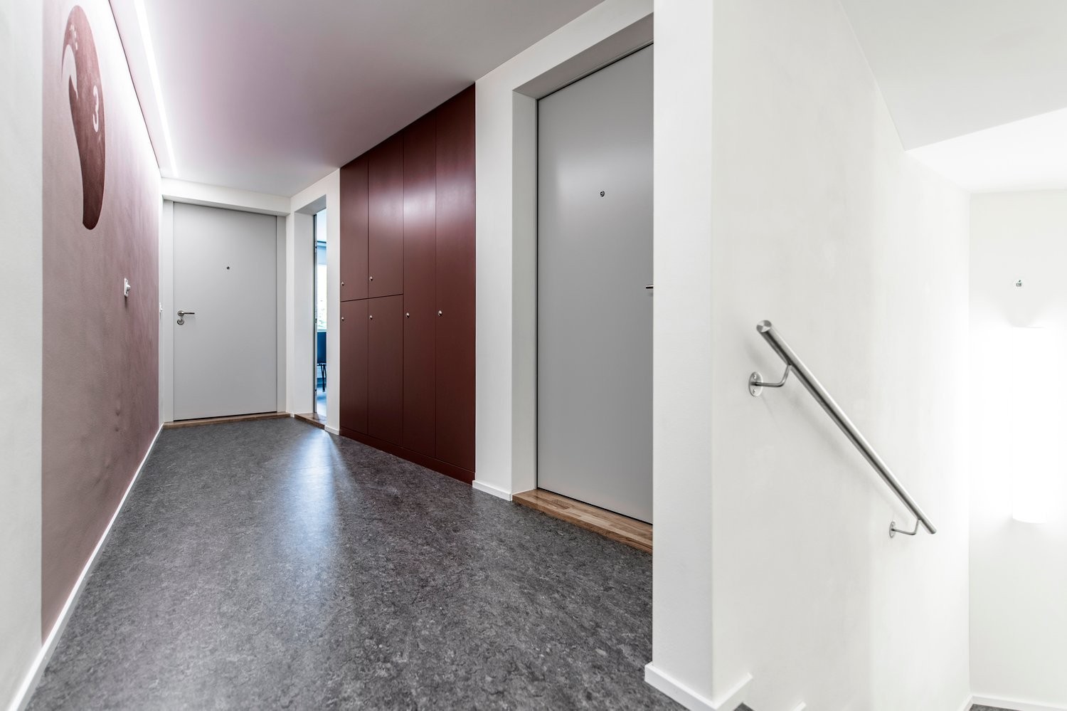 Die Wohnung verfügt über eine eigene Nasszelle (Dusche/WC) - für maximalen Komfort und Privatsphäre. Auf jedem Stockwerk steht eine moderne Gemeinschaftsküche zur Verfügung - ideal, um sich beim Kochen auszutauschen oder ab und zu gemeinsam den Tag ausklingen zu lassen. Abschliessbare Schränke im Korridor bieten zusätzlichen Stauraum. Im Untergeschoss befinden sich weitere Abstellmöglichkeiten sowie eine allgemeine Waschküche mit drei Waschtürmen - alles, was es für unkompliziertes Wohnen braucht.
