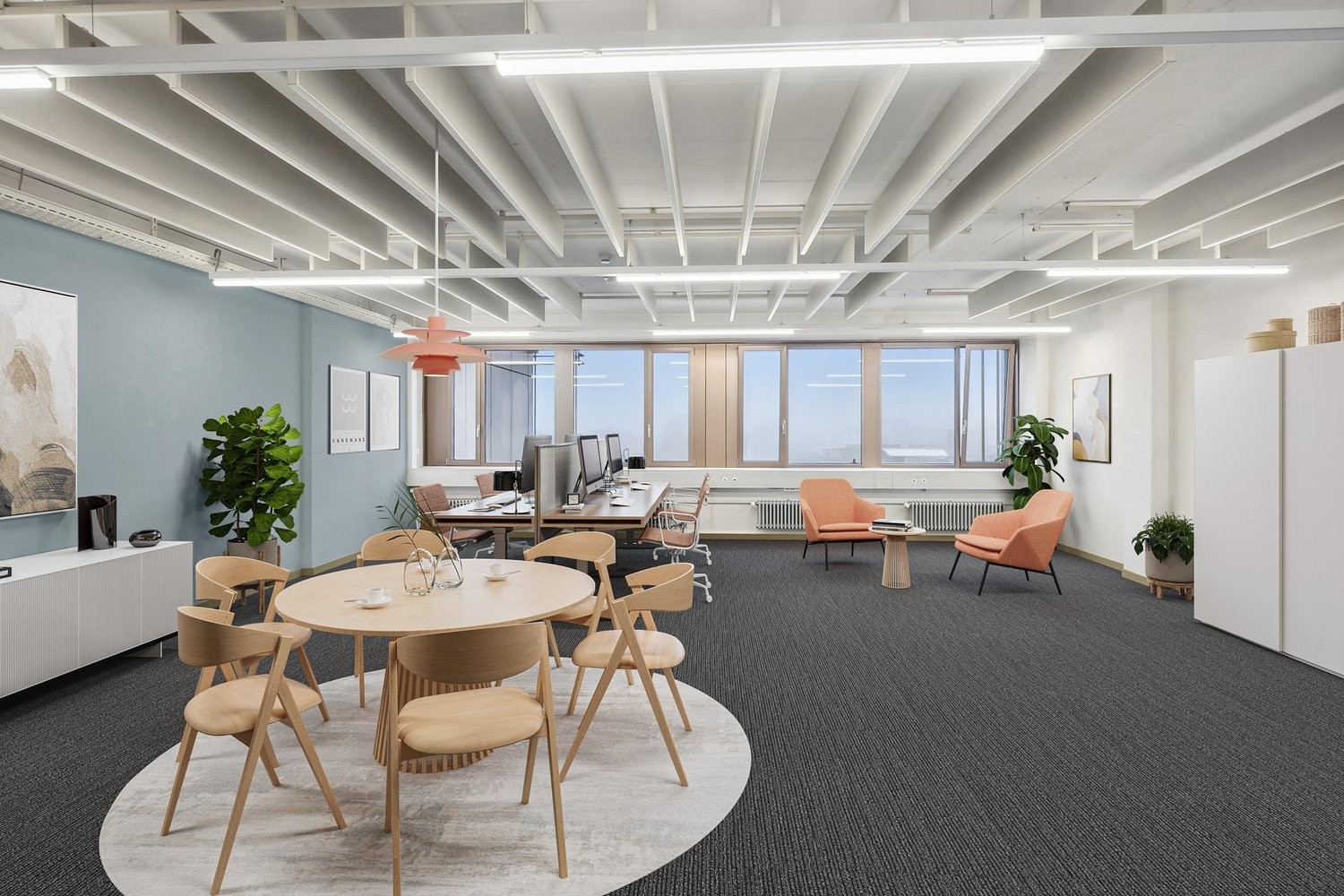 Der Teppichboden und die Beleuchtung ist Mieterausbau und kann wenn gewünscht übernommen werden.