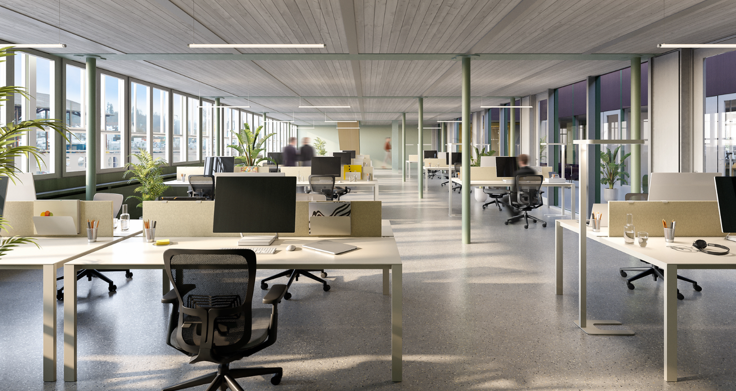 Die Büro- und Gewerbeflächen werden im Edelrohbau angeboten und sind mit einem effizienten «Kegel Klimasystem» ausgestattet, das den Raum über Konvektoren an der Fassade klimatisiert