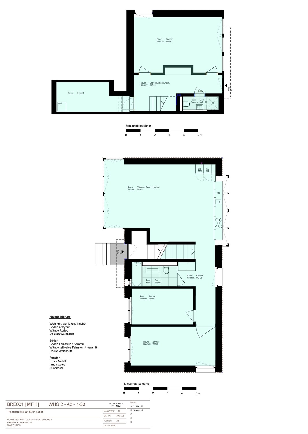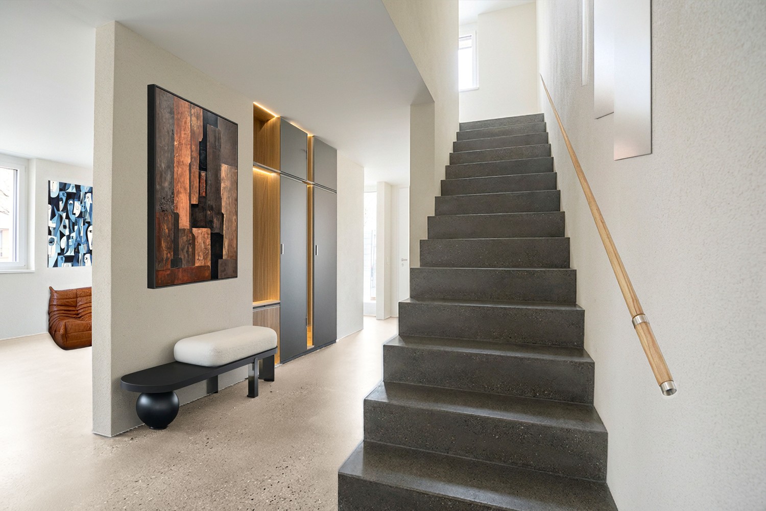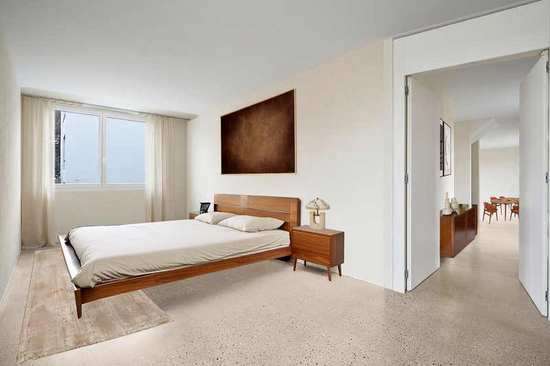 Die hochwertige Materialisierung sorgt für ein exklusives Wohngefühl. Ein durchgehender Anhydrit-Boden verleiht allen Zimmern einen modernen, loftartigen Charakter, während die Wände in feinem Abrieb und die Decken in Weissputz für eine helle Atmosphäre sorgen.