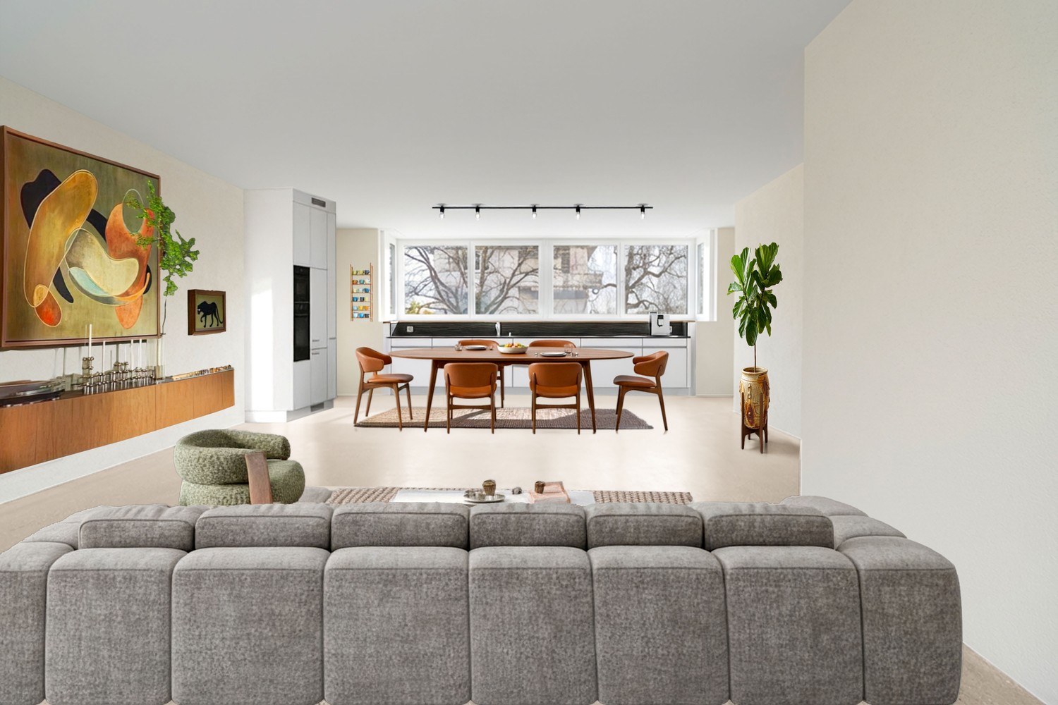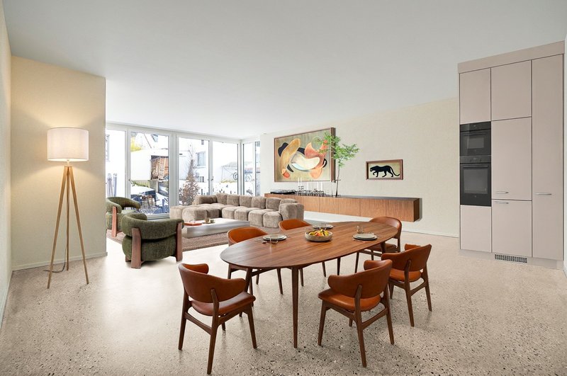 Wohnen & Essen: Der grosszügige, offene Wohn- und Essbereich bildet das Herzstück der Wohnung und wird durch grosse Fensterfronten mit Tageslicht durchflutet.