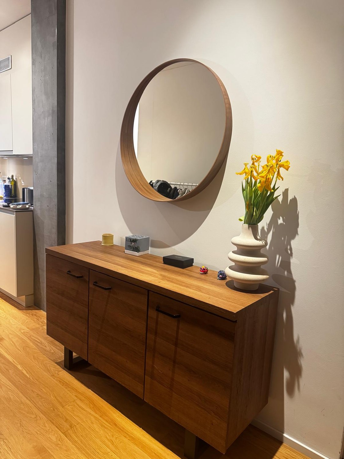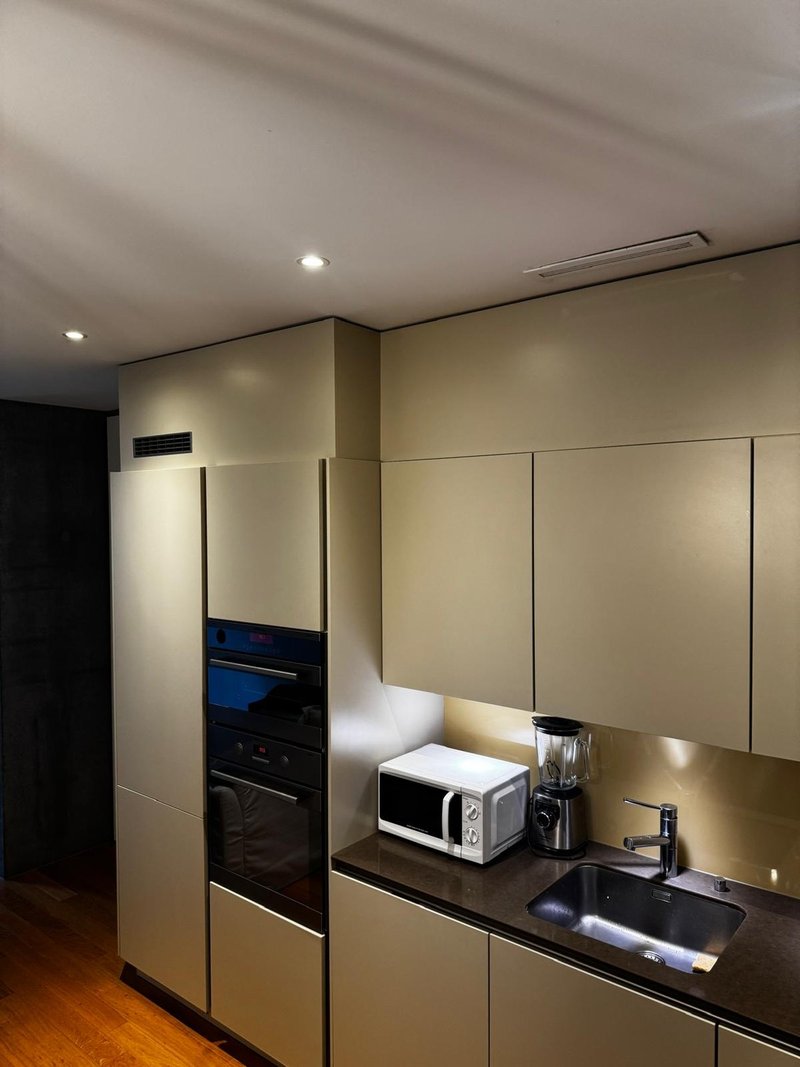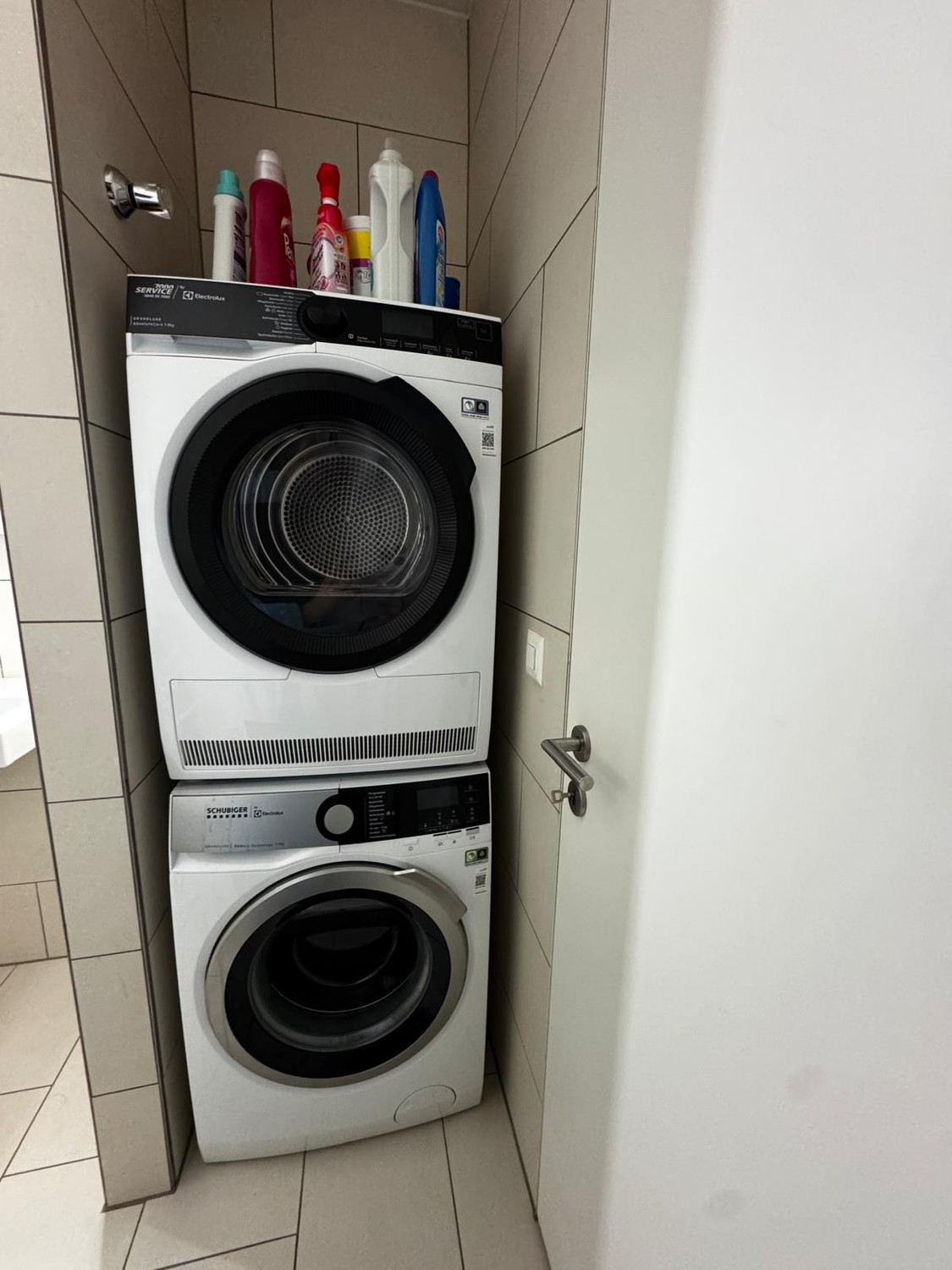 The kitchen is fully equipped with oven, steam oven and microwave, and the apartment includes a washing machine and dishwasher, both only 1 year old.