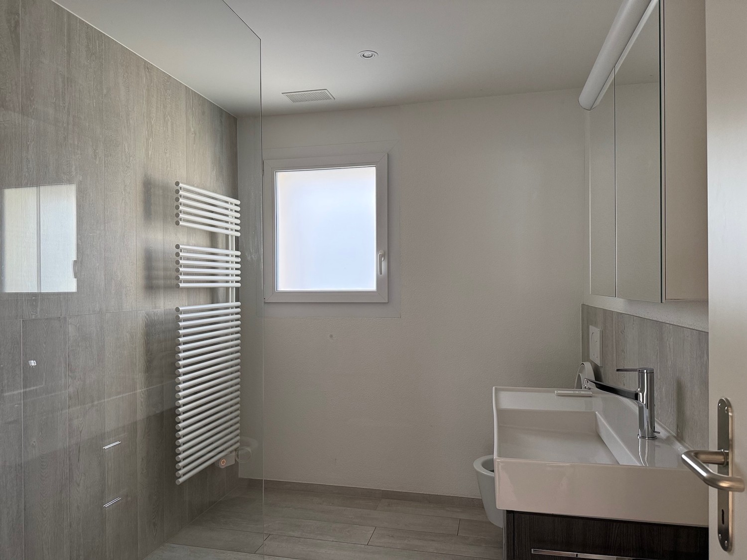 Begehbare, grosse Dusche mit Glaswand, grosser Waschtisch mit Unterbau und Spiegelschrank, Closomat