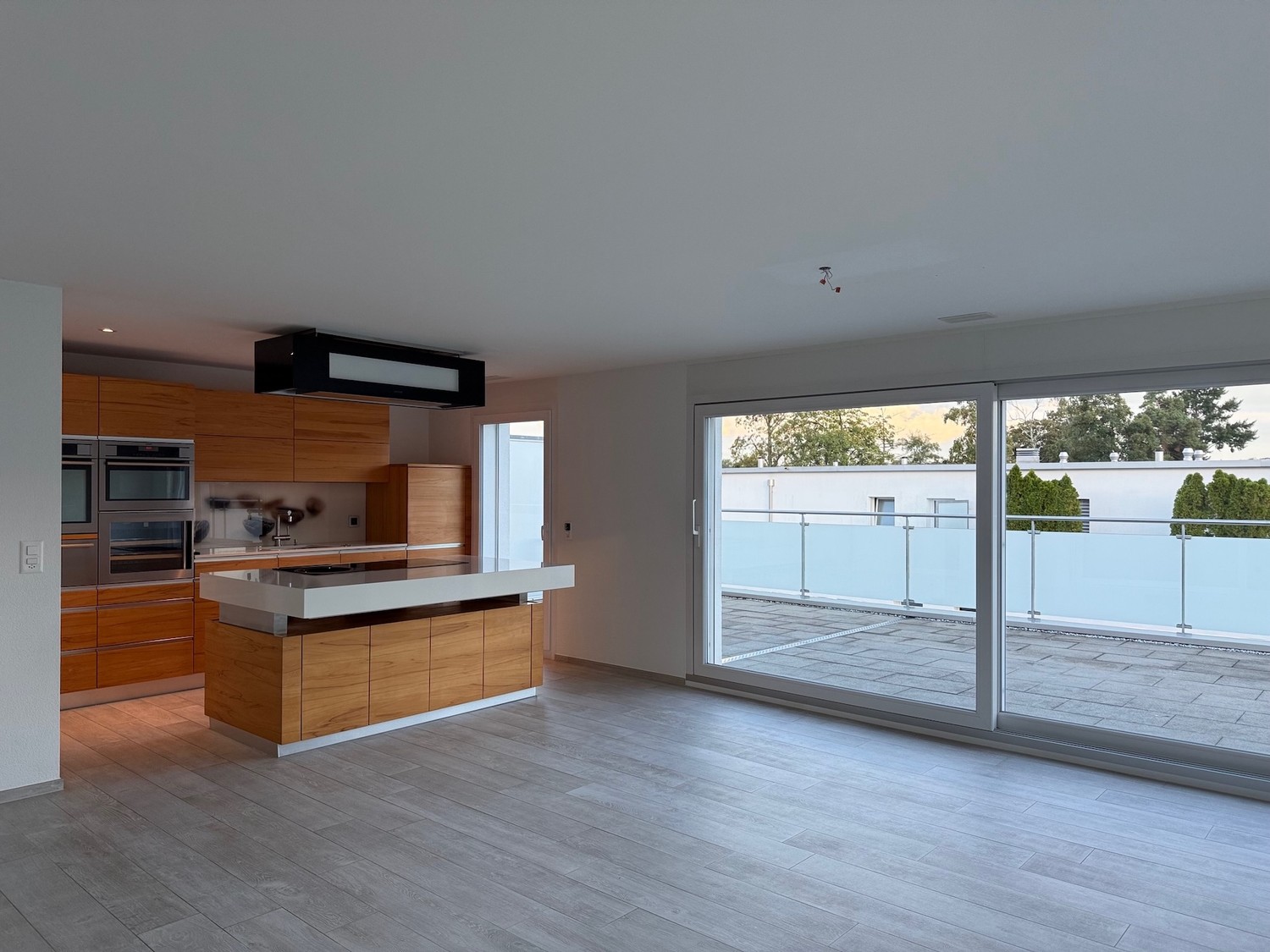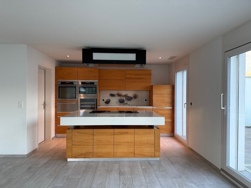 Die offene Küche verfügt über eine höhenverstellbare Kochinsel, welche gleichzeitig als Bar dient und einer ebenfalls höhenverstellbaren Design-Abzugshaube. Die Ausstattung bietet hochwertige Küchengeräte wie; Glaskeramik-Kochfeld mit Wok -Kochbereich mit Induktion, hochliegender Backofen/Combisteamer, ein zweiter Backofen mit Mikrowellenfunktion, Wärmeschublade, Weinkühler, Geschirrspüler, elektrisch öffnende Oberschränke und viel Stauraum. Die Fronten sind in Echtholz, die Arbeitsfläche mit einer weissen Granitsteinabdeckung und die Rückwand aus Glas.