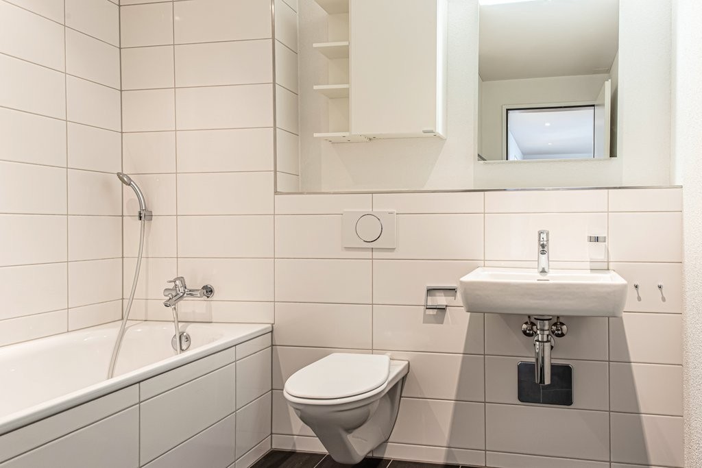 - Badezimmer mit WC, Lavabo, Spiegelschrank und Badewanne