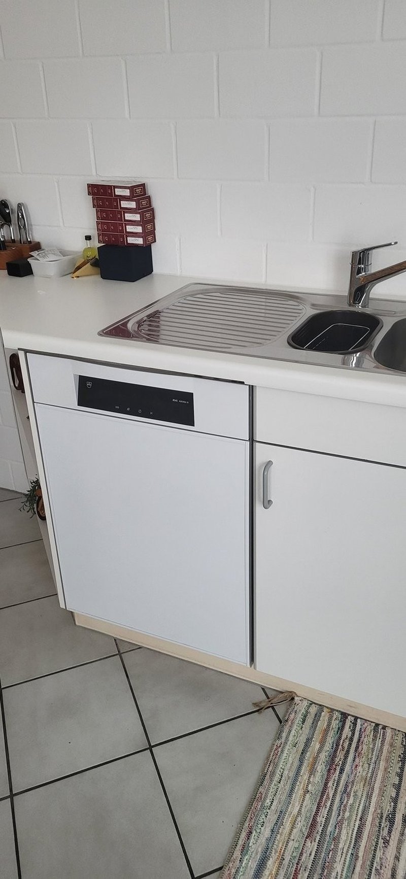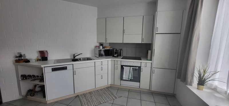 Offene Küche: ausgestattet mit weissen Schränken, Geschirrspüler und Backofen