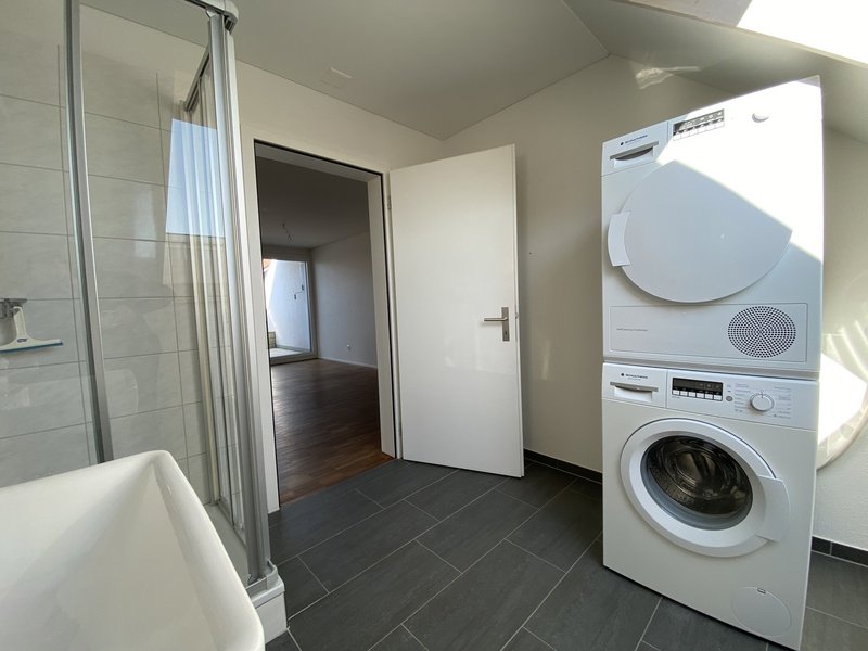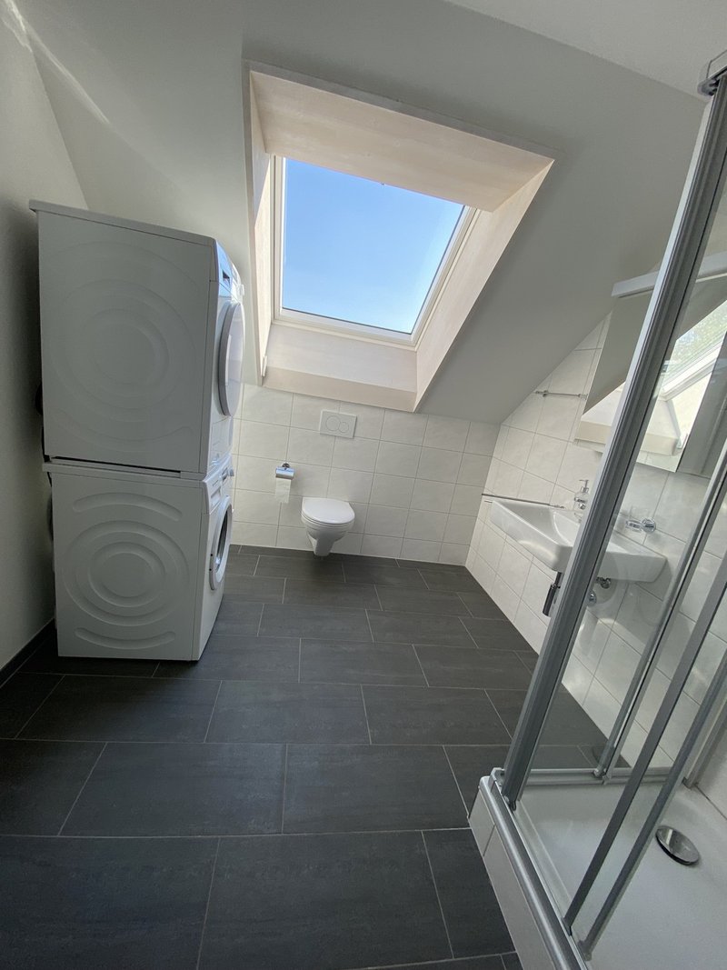 separates WC mit Dusche und praktischem Waschturm (Waschmaschine & Tumbler)