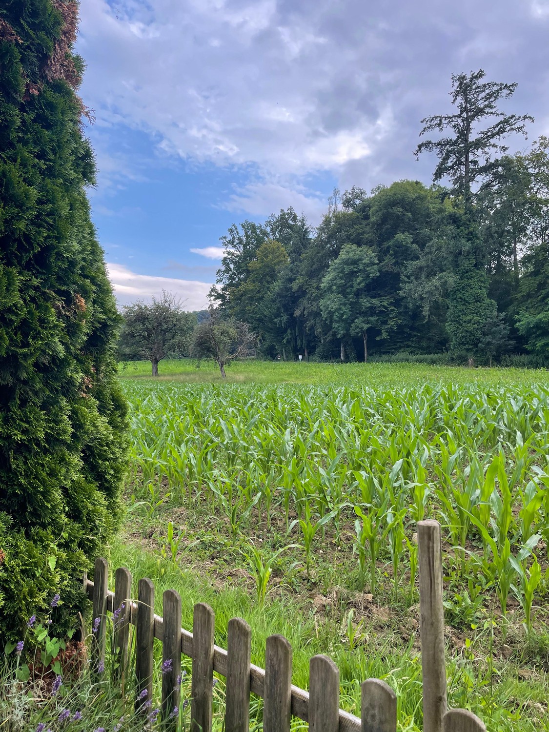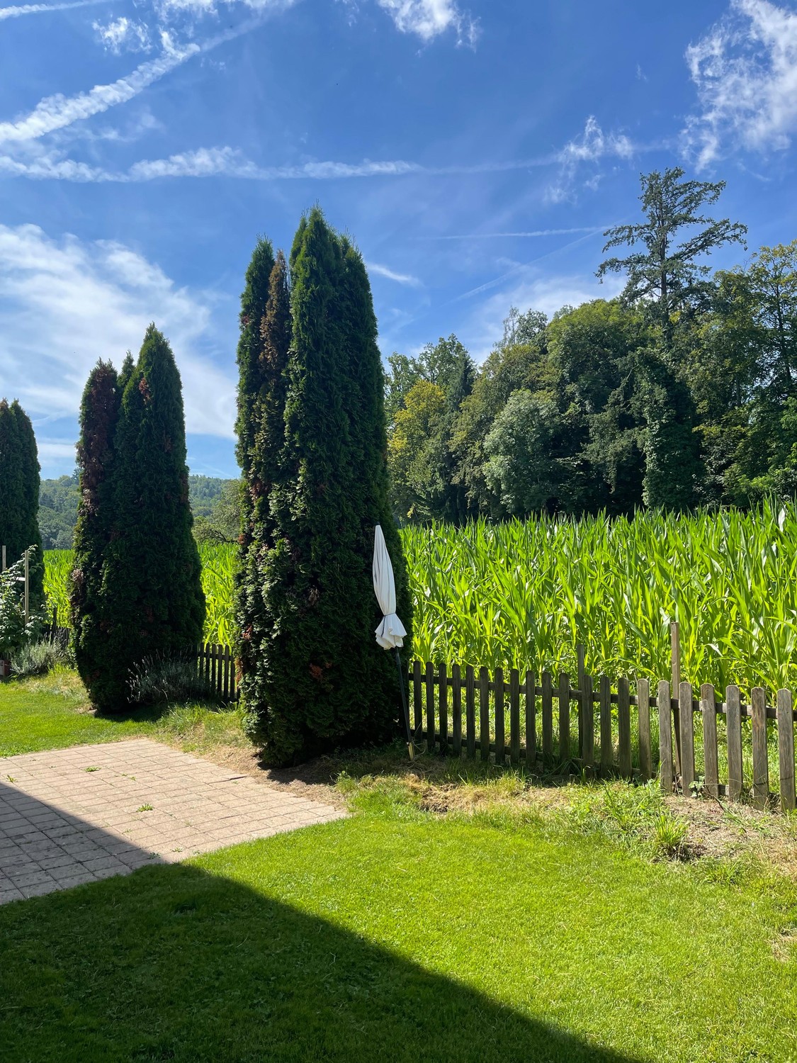 - Da es sich um das Eckhaus handelt, hast du direkt Aussicht auf das Feld und den Wald