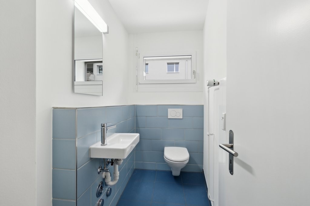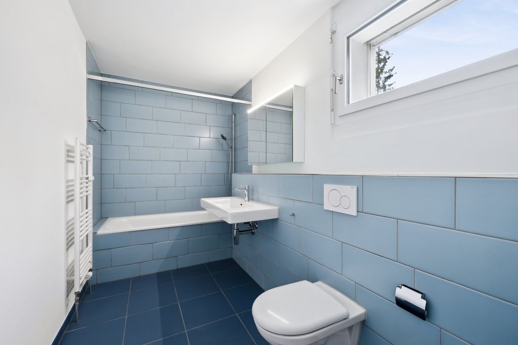 - Nasszelle in blauem Ton. Mit Plattenboden, Wände mit Weissputz und Wandplatten, Badewanne, Lavabo, WC und Spiegelschrank