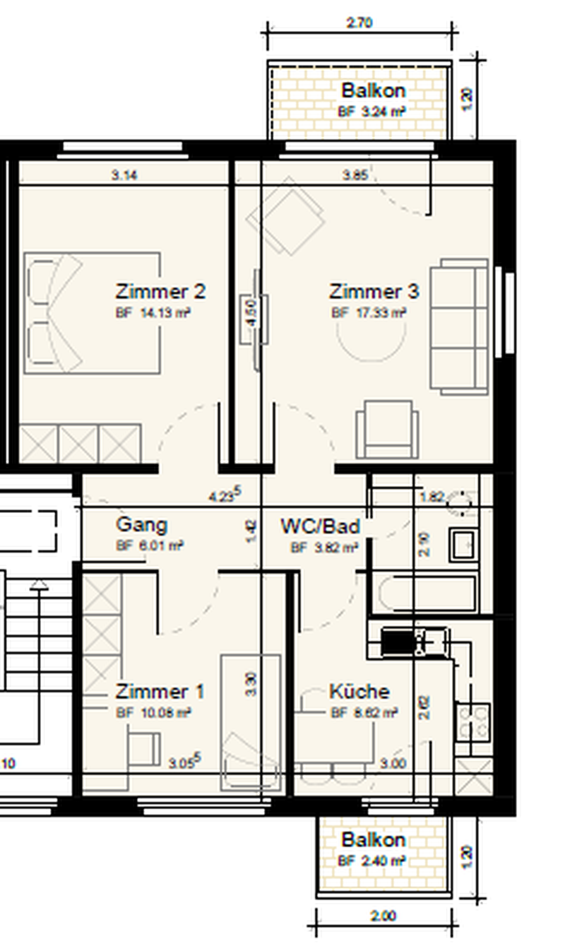 - alle Zimmer Parkettböden (17m2, 14m2, 10m2)