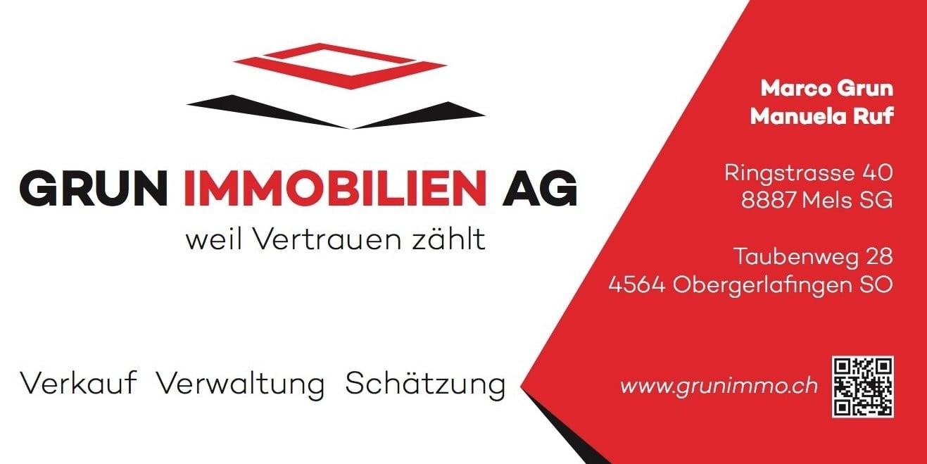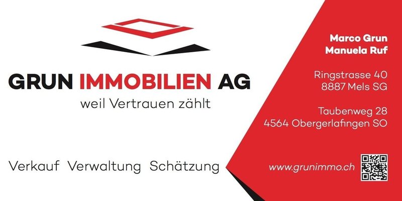Bitte kontaktieren Sie uns via Kontaktformular mit den vollständigen Angaben zur Ihrer Person . Fehlerhafte Anfragen werden nicht beantwortet. Wir freuen uns auf Sie. Ihr regionaler Immobilienpartner in Mels SG - Marco Grun und Manuela Ruf, Ringstrasse 40, 8887 Mels