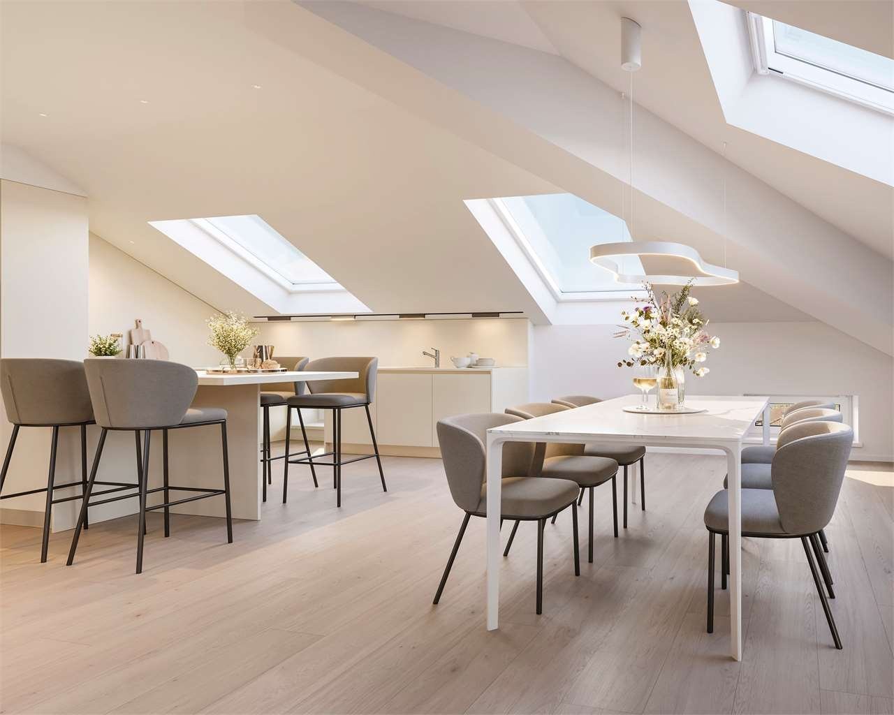 Zona living: Il soggiorno di ca 52 m2 si apre su una moderna cucina a vista di ca 15 m2 con isola. Tavolo da pranzo con sedie, mobile con predisposizione TV e scrittoio, divani.