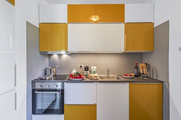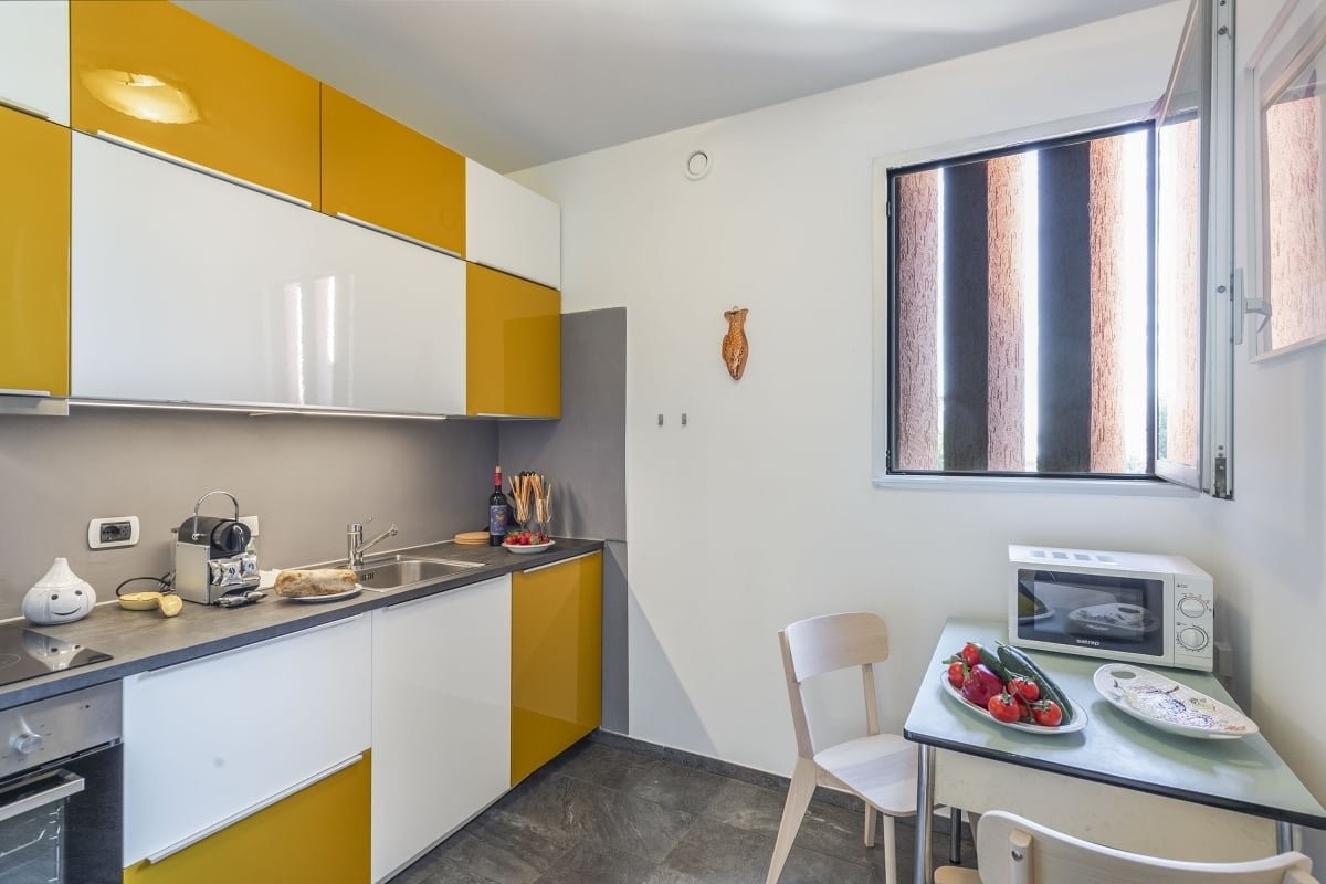 Modern Kitchen: Beautifully appointed with yellow and white cabinets, stainless steel appliances including a dishwasher, and a cozy dining area perfect for daily meals.