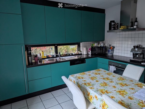 Cucina moderna: Completamente attrezzata con armadi turchese, elettrodomestici appena sostituiti, piano di lavoro , lavastoviglie e finestra dal pavimento al soffitto