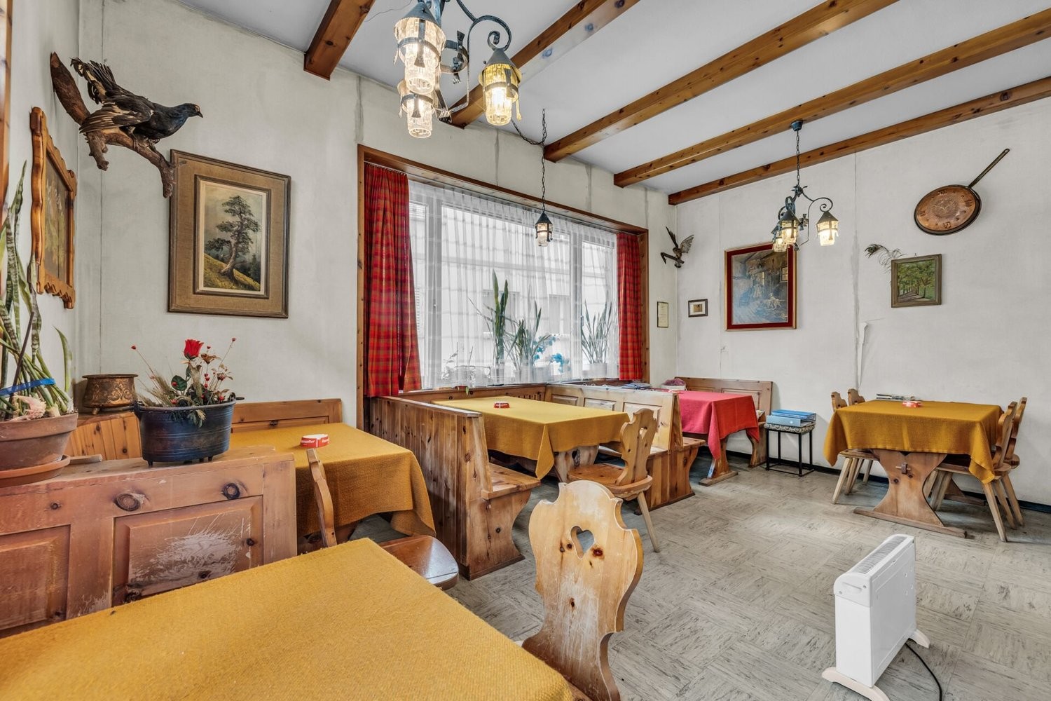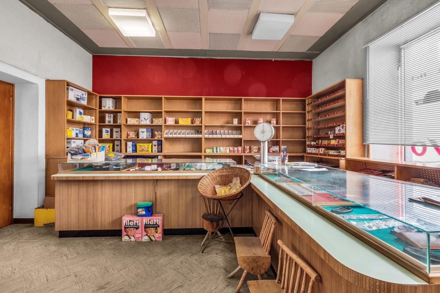Das Erdgeschoss empfängt mit einem einladenden Foyer, das durch seine offene Bauweise viel Tageslicht erhält. Der gewerbliche Bereich umfasst ein ehemaliges Restaurant mit authentischer Ausstattung, Holzbalkendecke und grossen Verglasungen, die für eine helle und freundliche Atmosphäre sorgen. Angrenzend befindet sich ein weitläufiger Ladenbereich mit Bar und separatem Verkaufsraum, der sich für verschiedene Geschäftsmodelle eignet. Ergänzt wird dieses Geschoss durch ein stilvoll eingerichtetes Nagelstudio sowie ein separates Solarium mit angenehmer Beleuchtung.