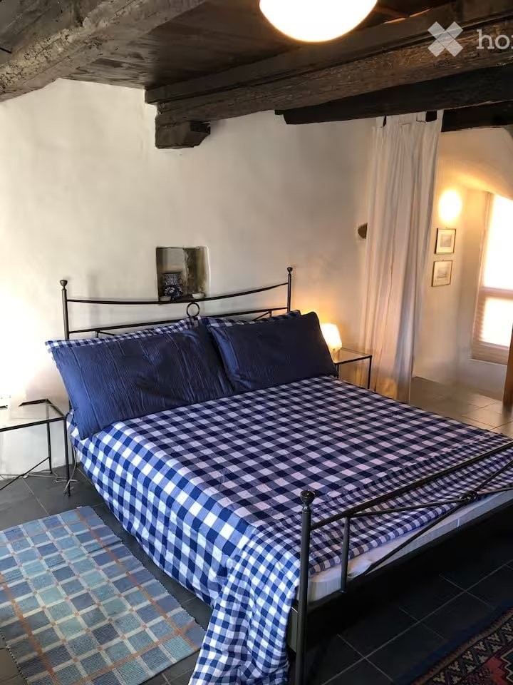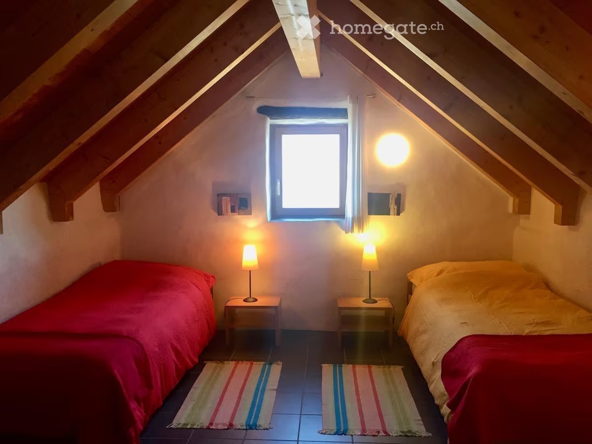 Schlafzimmer: Klein, intim und mit sichtbaren Holzbalken.