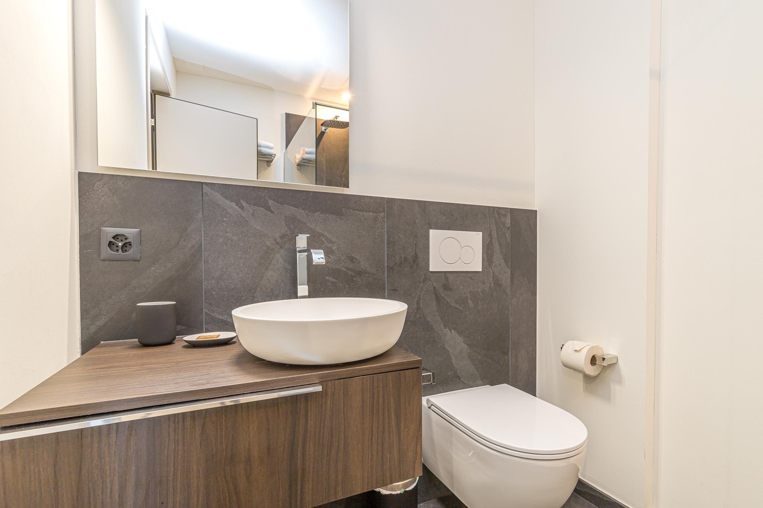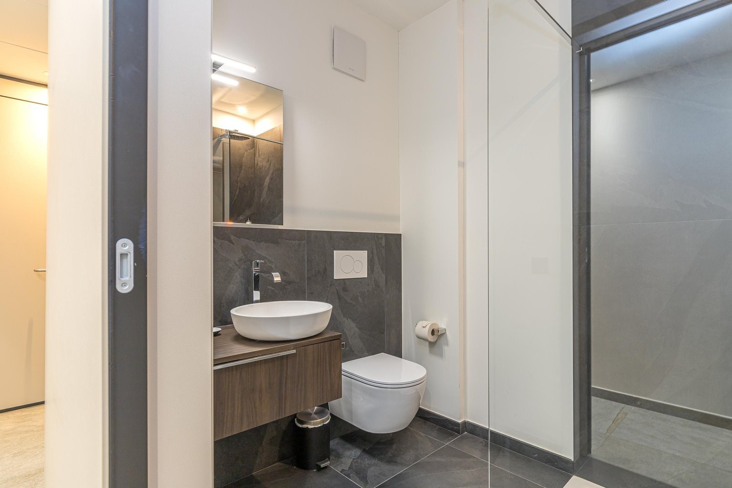 The stylish stone-tiled bathroom has a glass shower, large basin and WC.