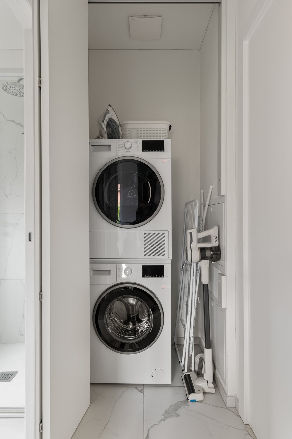 The apartment includes a living area with a sofa bed, dining table with chairs, TV cabinet, as well as a kitchen and a terrace. In the separate sleeping area, there is a bedroom with a wardrobe, a double bed with bedside tables, a bathroom, and a laundry corner with a washer-dryer column.