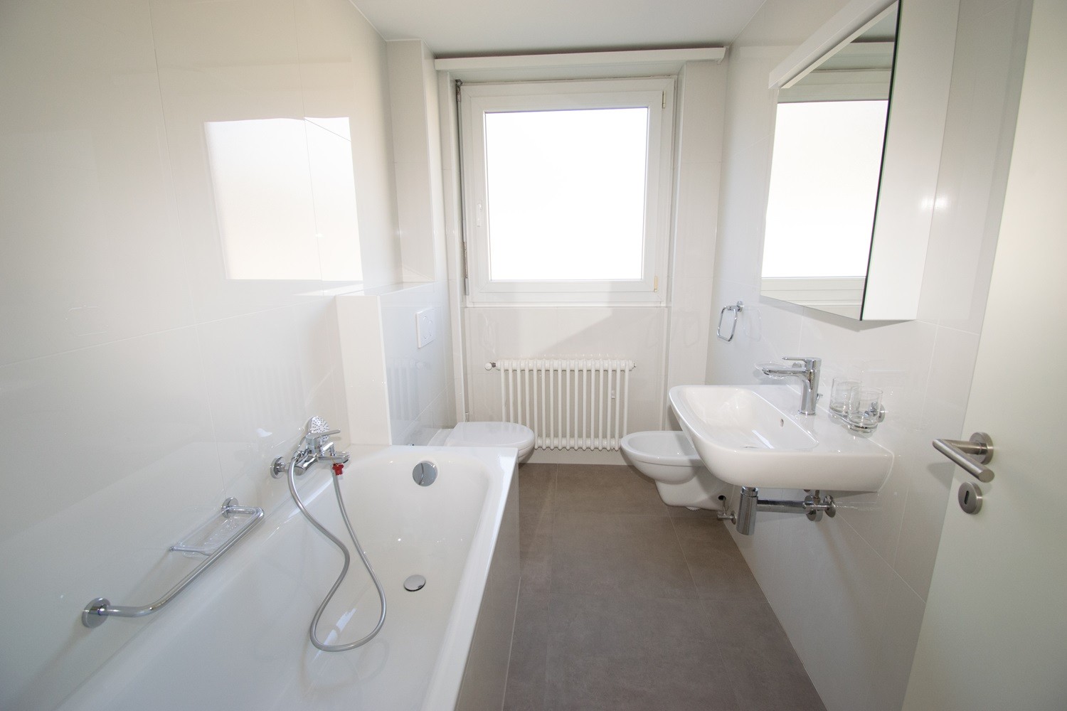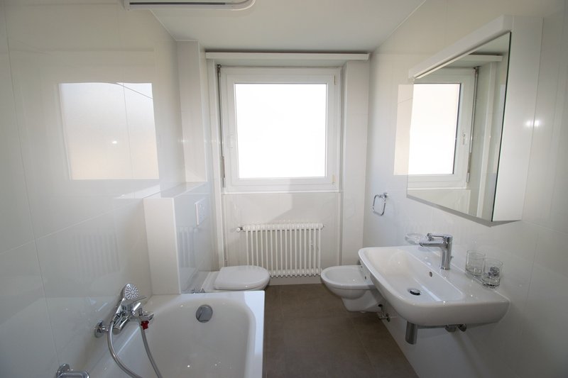 Il bagno moderno offre una vasca da bagno, un armadio a specchio, WC e bidet e si presenta con un design intramontabile e curato.