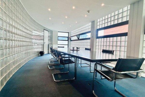 The well-designed and functional interiors feature a large entrance with a reception area, three individual offices, a relaxation area with kitchen, a spacious meeting room, a server room, and three restrooms.