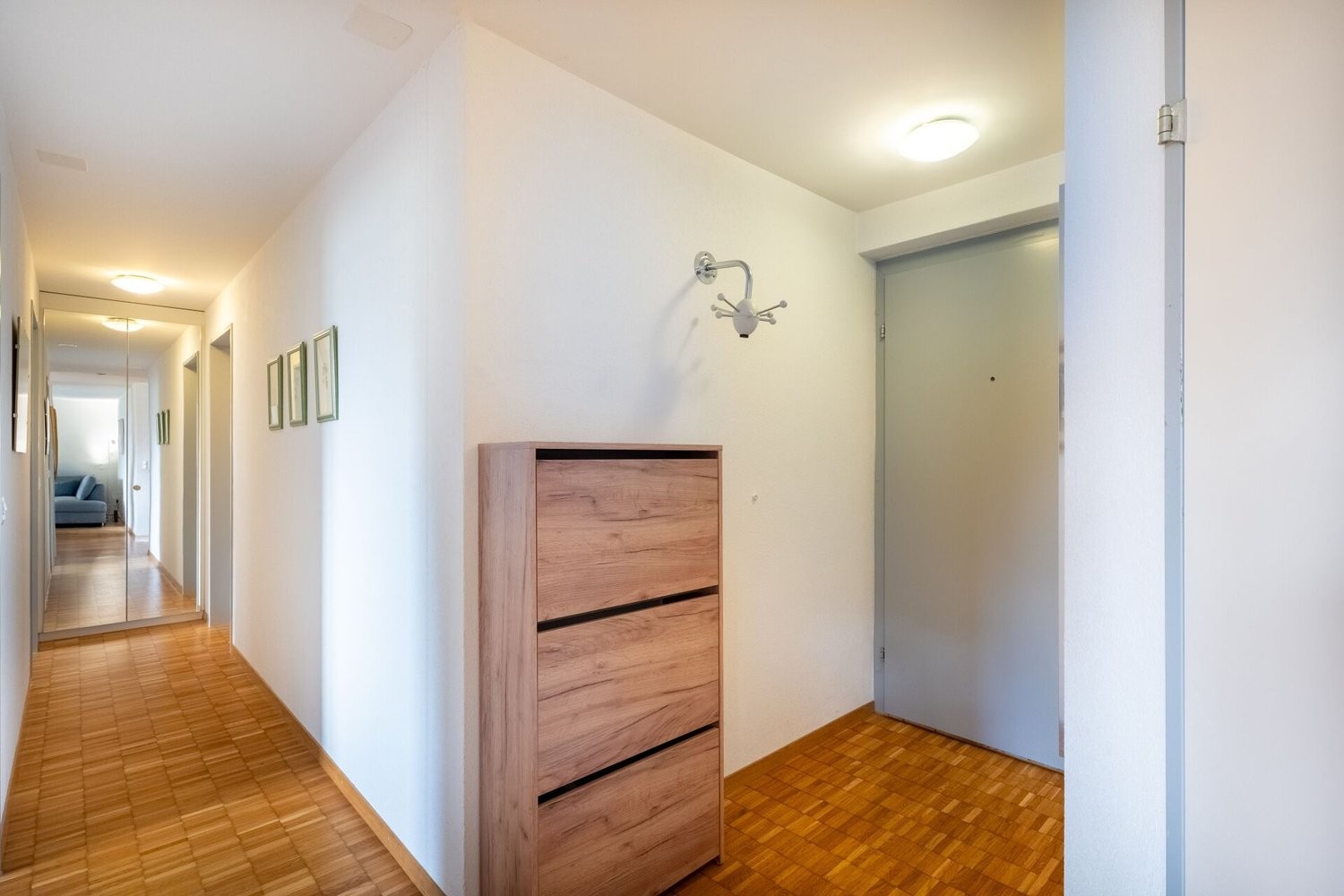 Ein praktischer Einbauschrank im Flur sorgt für zusätzlichen Stauraum. Abgerundet wird dieses Angebot durch einen eigenen Kellerraum, die komfortable gemeinschaftliche Waschküche auf derselben Etage sowie einen Parkplatz. Zudem ist bei der Treppe, die zum Haus führt, ein Treppenlift vorhanden.