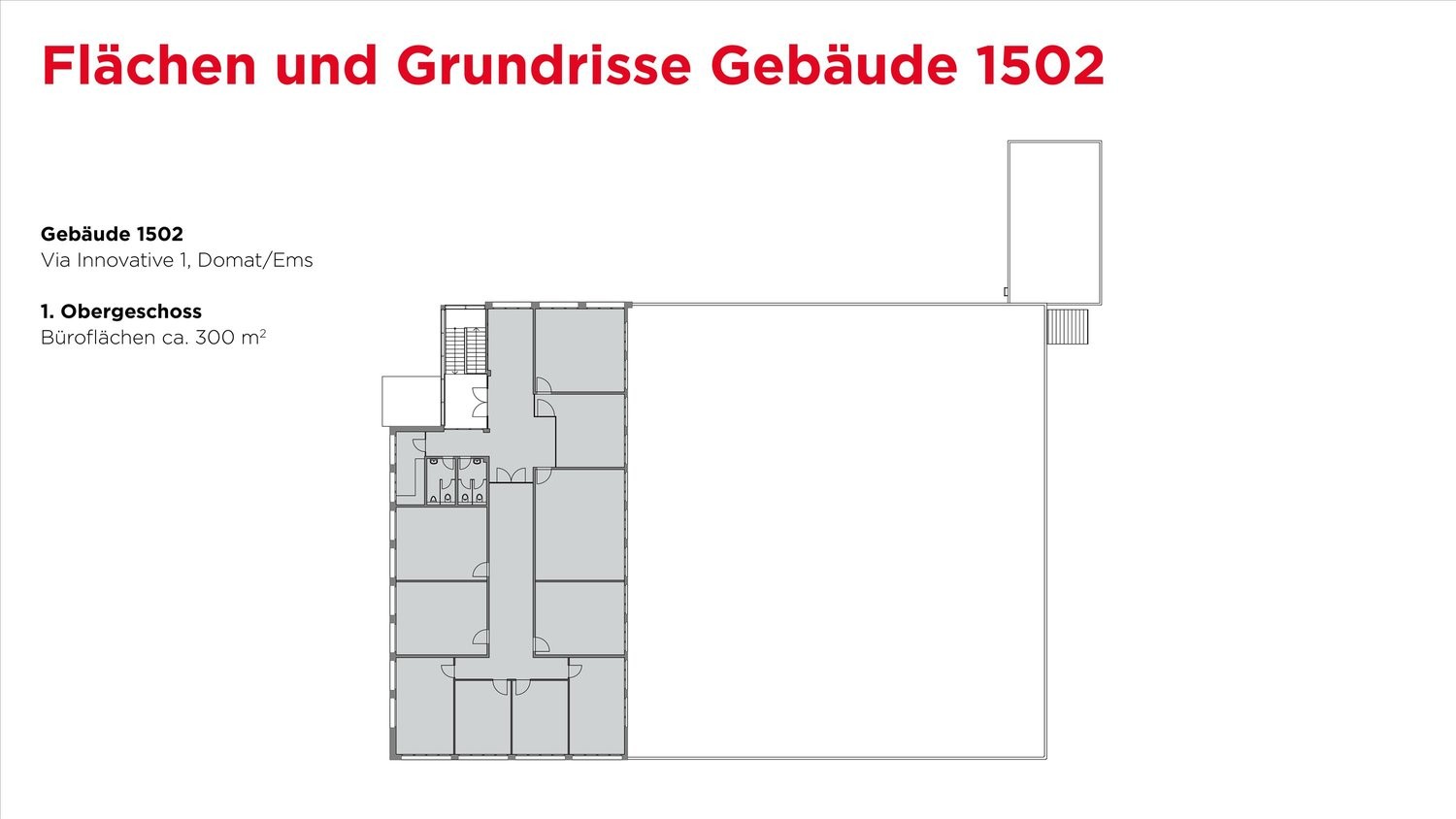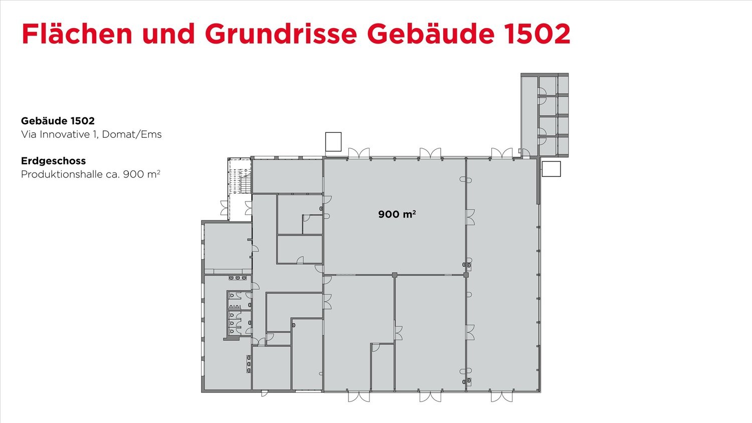 Auf dem etablierten Gewerbeareal der EMS-Chemie in Domat/Ems stehen 954 m² Produktions- und Lagerfläche sowie 263 m² Bürofläche zur Vermietung. Der Standort besticht durch seine direkte Lage an der A13, der zentralen Nord-Süd-Verkehrsachse der Schweiz, und ermöglicht so eine optimale Erreichbarkeit für Mitarbeitende, Kunden und Partner.