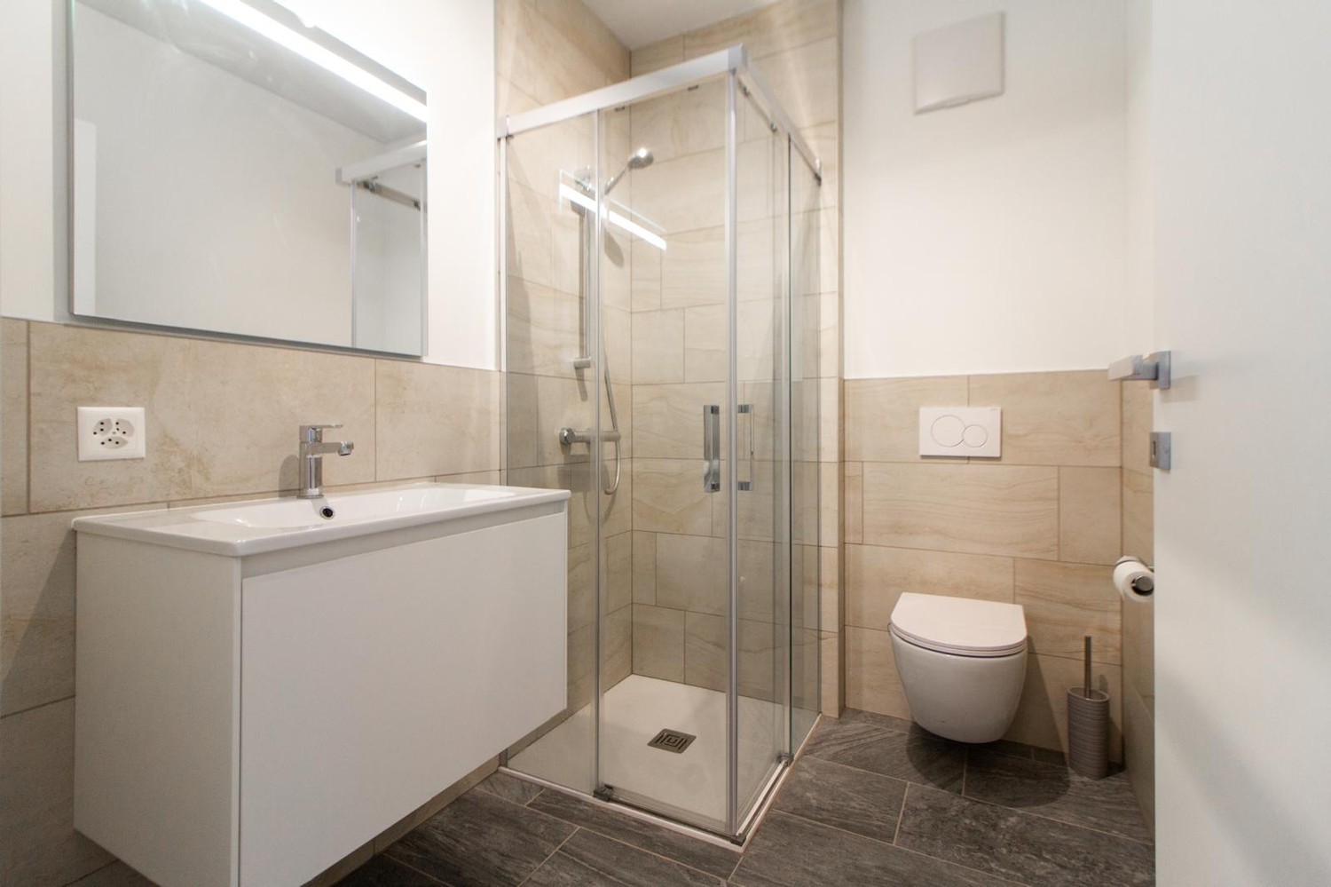 • Bagno con doccia, lavandino e WC