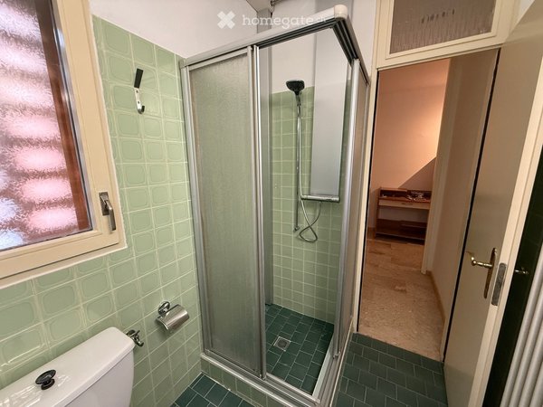 Secondo servizio, circa 3 metri quadrati, finestrato, con mobile lavandino, water e doccia, armadietto con luce e specchio.