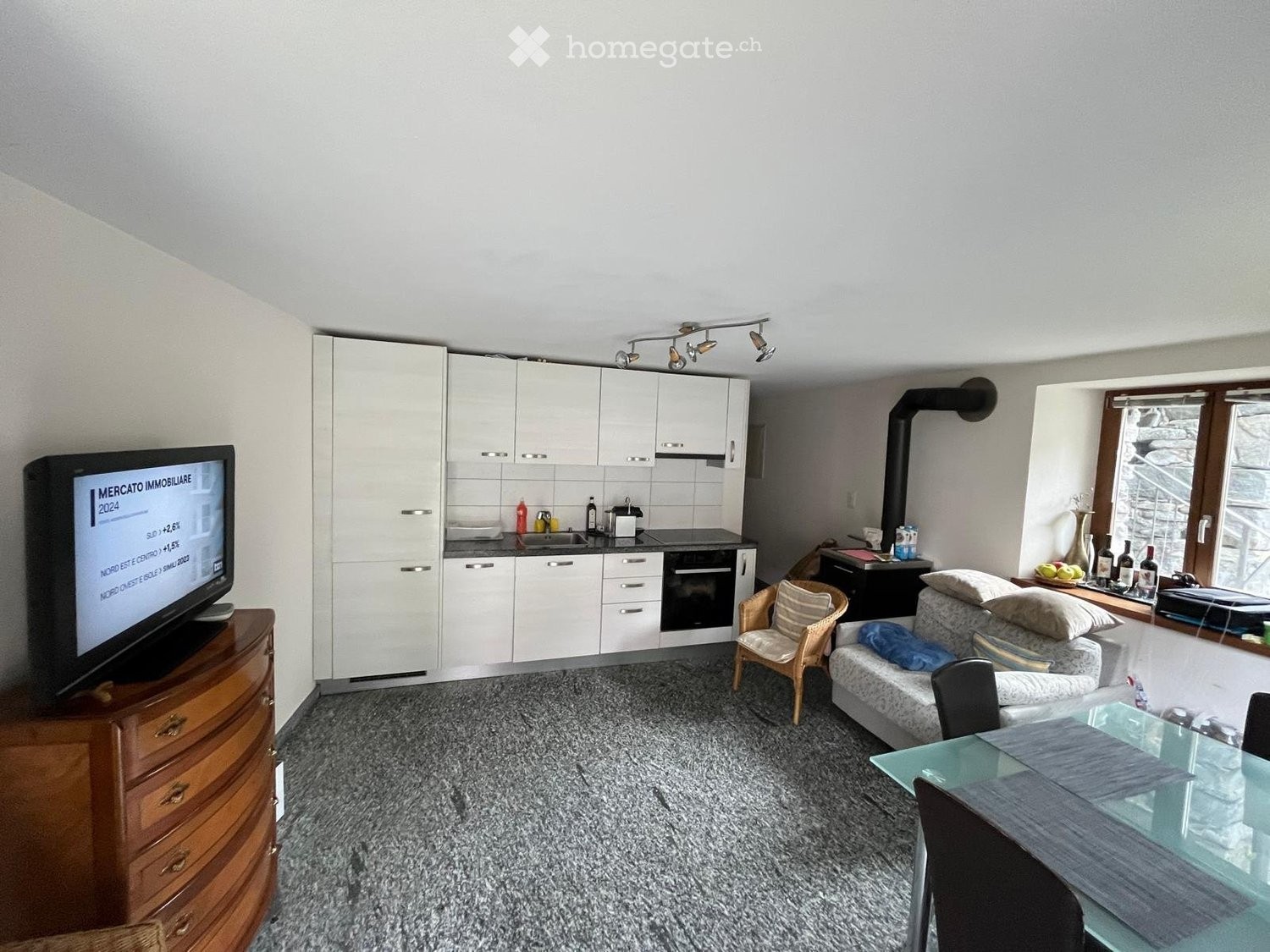 Zu vermieten: gemütliche Wohnung von ca. 40 m² im Erdgeschoss eines typischen Steinhauses im Zentrum von Bignasco (Via Paese Vecchio 15).