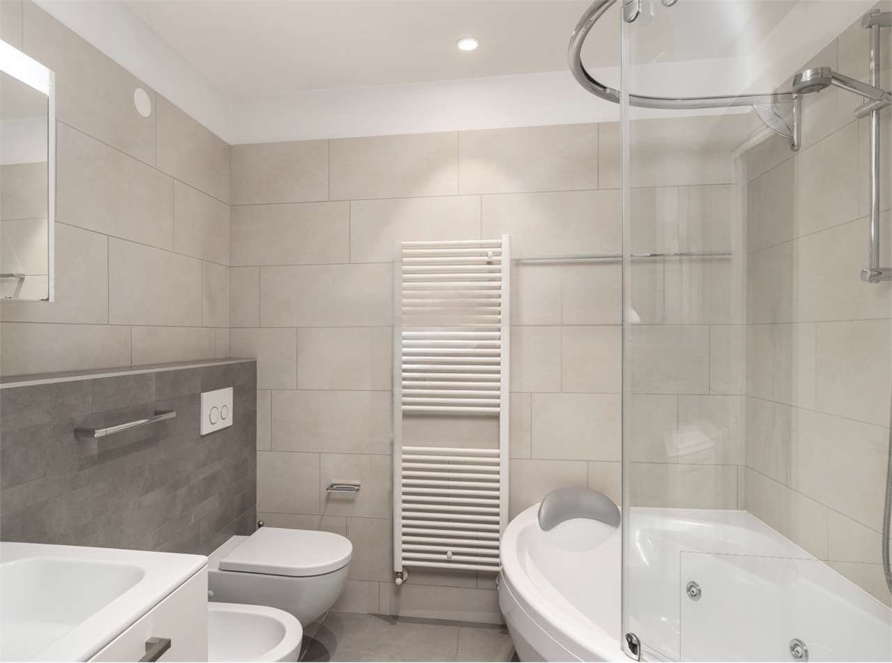 - Bagno elegante con WC, bidet, vasca da bagno e lavabo;