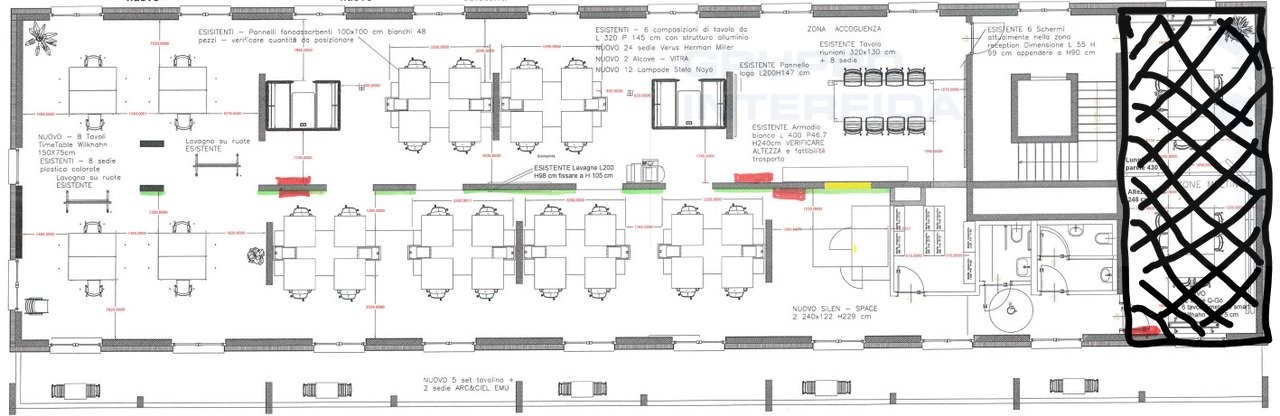 - zona meeting con tavoli Wilkhahn modello time table, lavagne su ruote e schermi a parete.