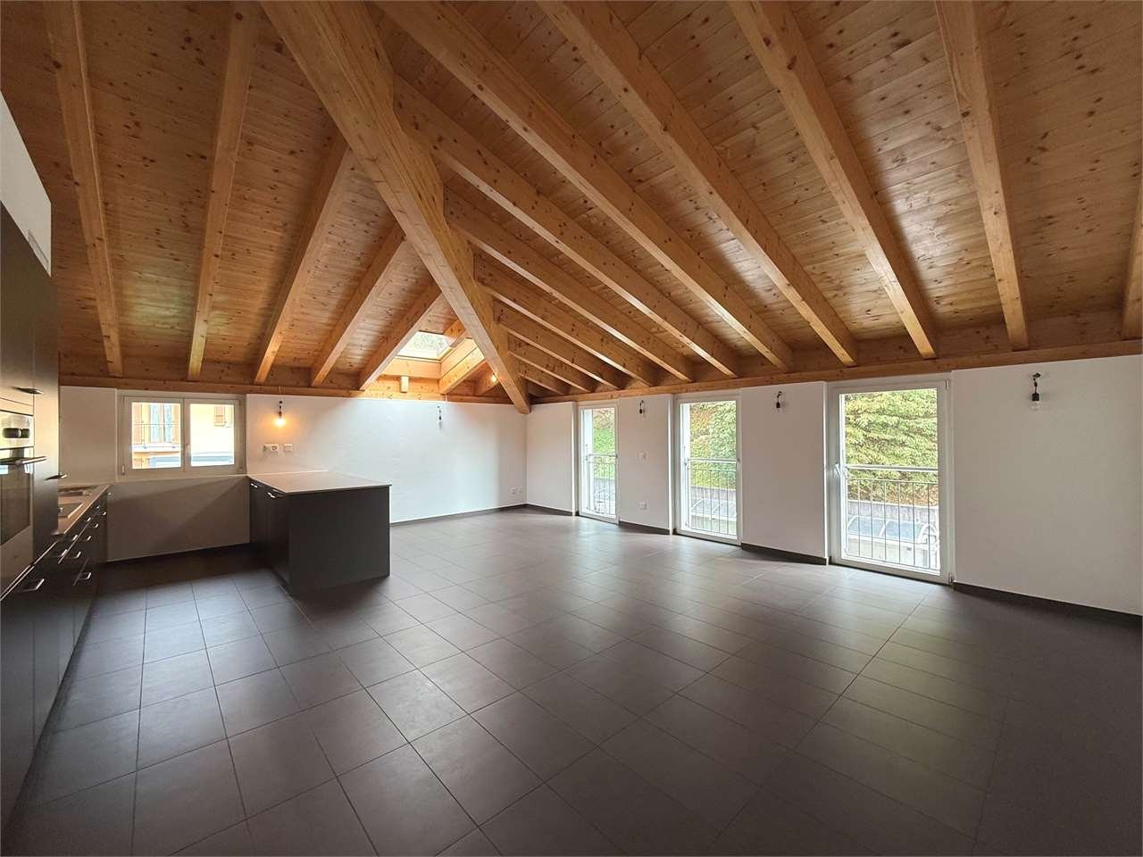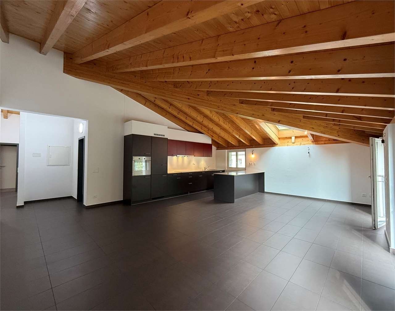 Zona giorno open-space con alti soffitti e travi a vista, ampissimo soggiorno con cucina di design a vista, ideale per vivere e ricevere con stile. Atrio dingresso elegante e bagno di servizio con doccia.