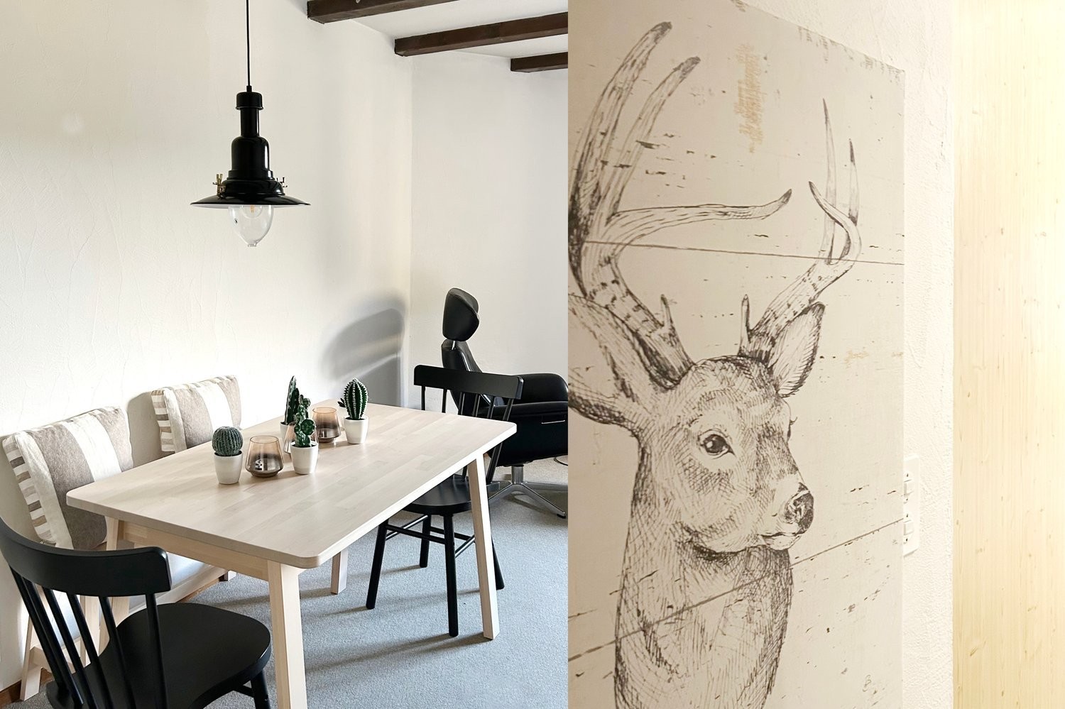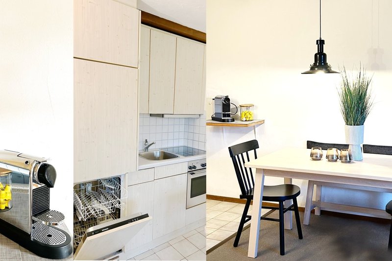 Der kombinierte Wohn- und Schlafbereich ist mit einem Doppelbett 160x200cm, Kleiderschrank, Loungesessel, Esstisch mit Bank und Stühlen sowie TV und Internet ausgestattet. Die offene Küche ist mit Geschirrspüler, Backofen, Ceranfeld, Nespresso-Kaffemaschine, Elektrogeräten wie Wasserkocher und Toaster, Fondue- und Raclette-Sets, Koch- und Essgeschirr großzügig ausgestattet.