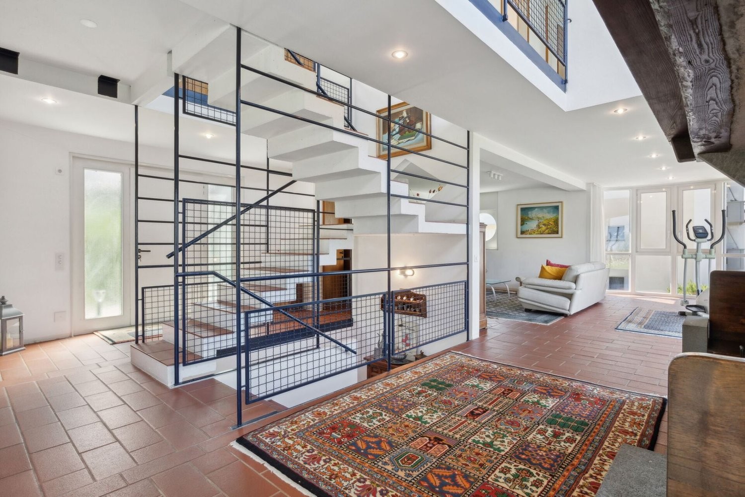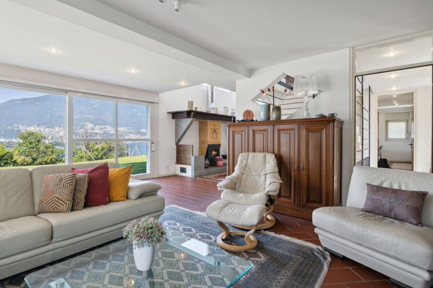 Beim Betreten des Hauses empfängt Sie ein geräumiger Eingangsbereich. Angrenzend an den Eingangsbereich ziehen sich die markanten Stufen der Innentreppe, die Sie vom Untergeschoss bis ins Obergeschoss begleiten. Die Treppe wird vom weitläufigen Wohnbereich umschlossen und brilliert durch die grossen Fensterfronten, welche eine bezaubernde Sicht auf den Lago Maggiore und direkten Zugang zum nach Süd-Ost ausgerichteten Garten liefert.