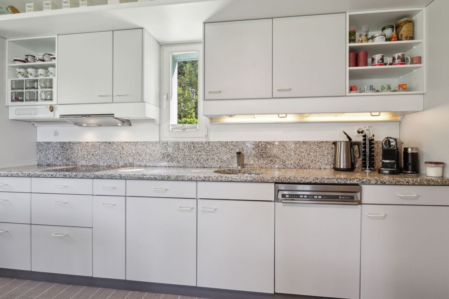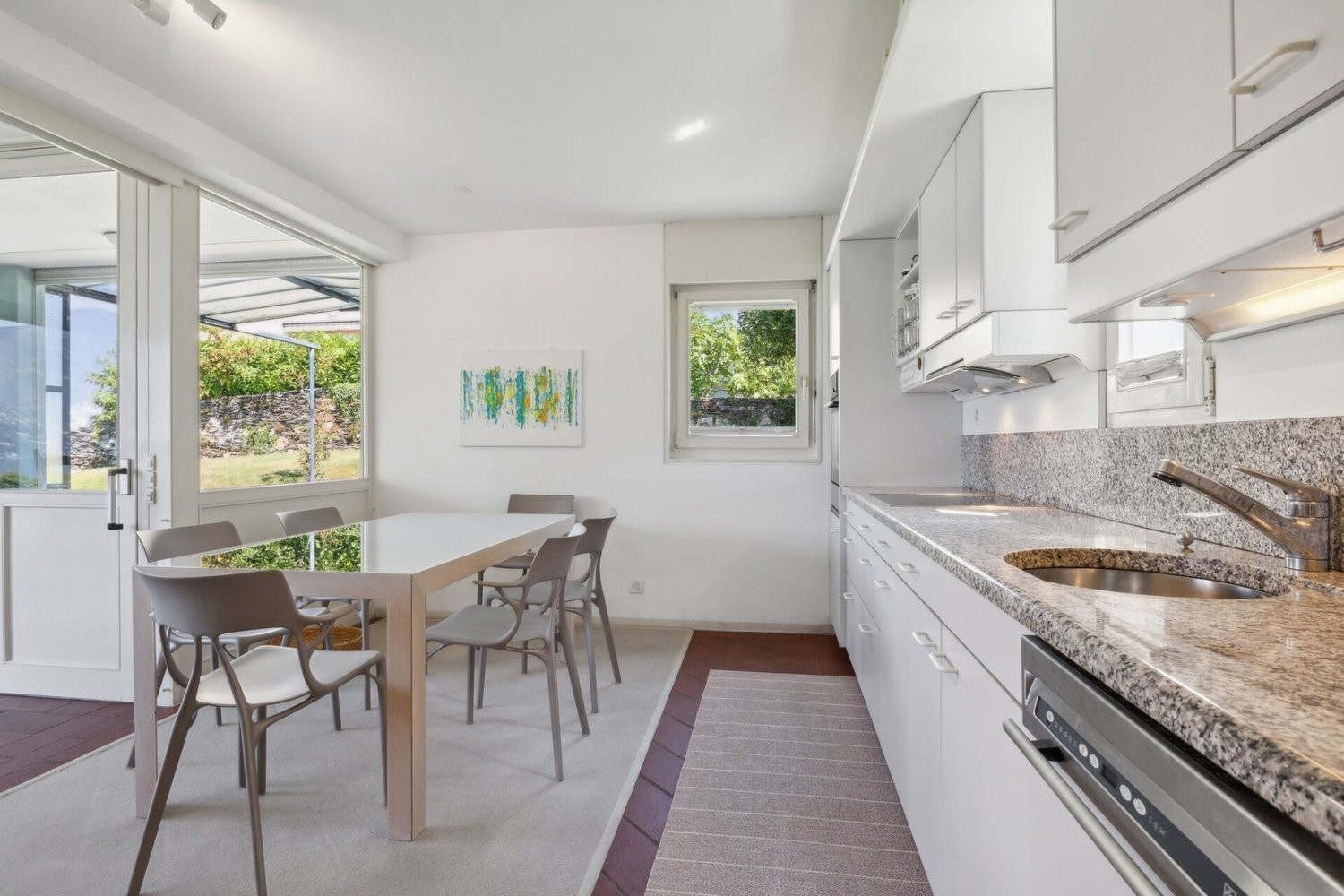 Ein praktisches, angrenzendes Reduit bietet viel Stauraum. Der offene Grundriss ermöglicht es Ihnen, während des Kochens mit Gästen am Esstisch oder im Wohnzimmer zu kommunizieren. Angrenzend an den Essbereich gelangen Sie direkt auf die überdachte, östlich ausgerichtete Veranda.