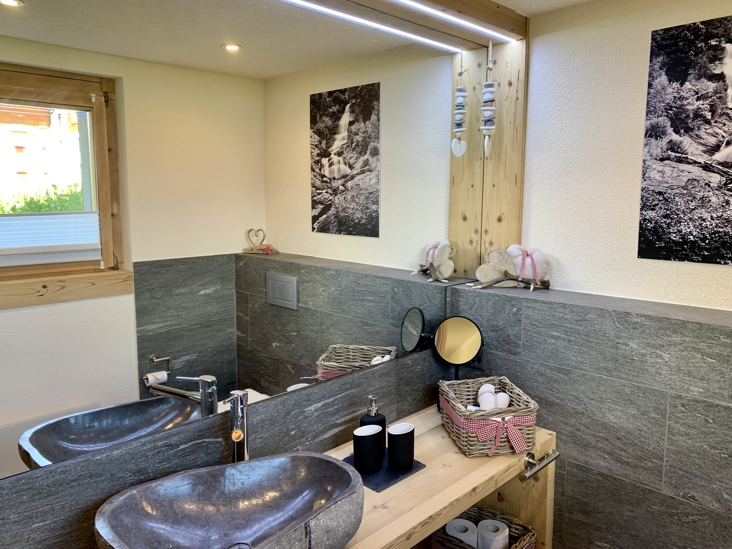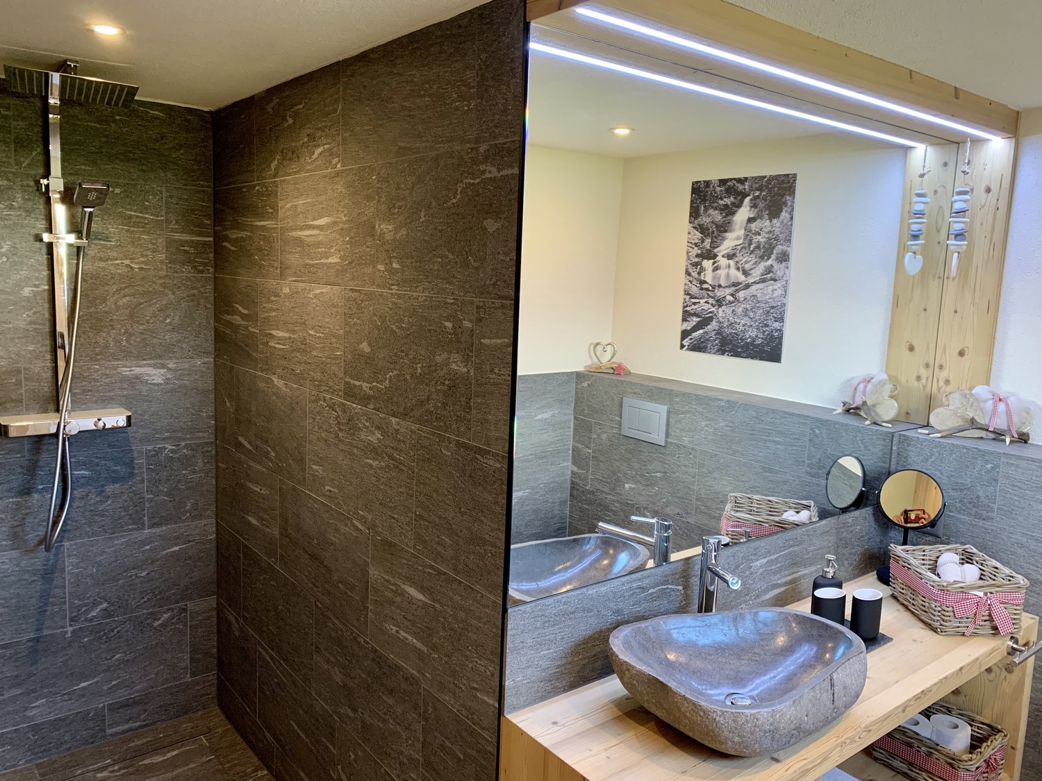 Bad mit Walk-in-Regendusche, Lavabo & WC.