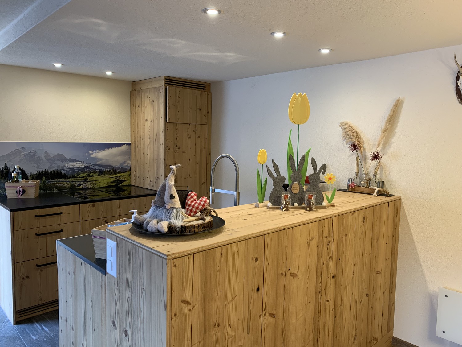Moderne Küche mit Backofen, Geschirrspüler, Induktionskochfeld, Kühlschrank mit Gefrierfach, Kaffeemaschine, Wasserkocher, Racletteofen sowie Fondueset für Käse & Fleisch.