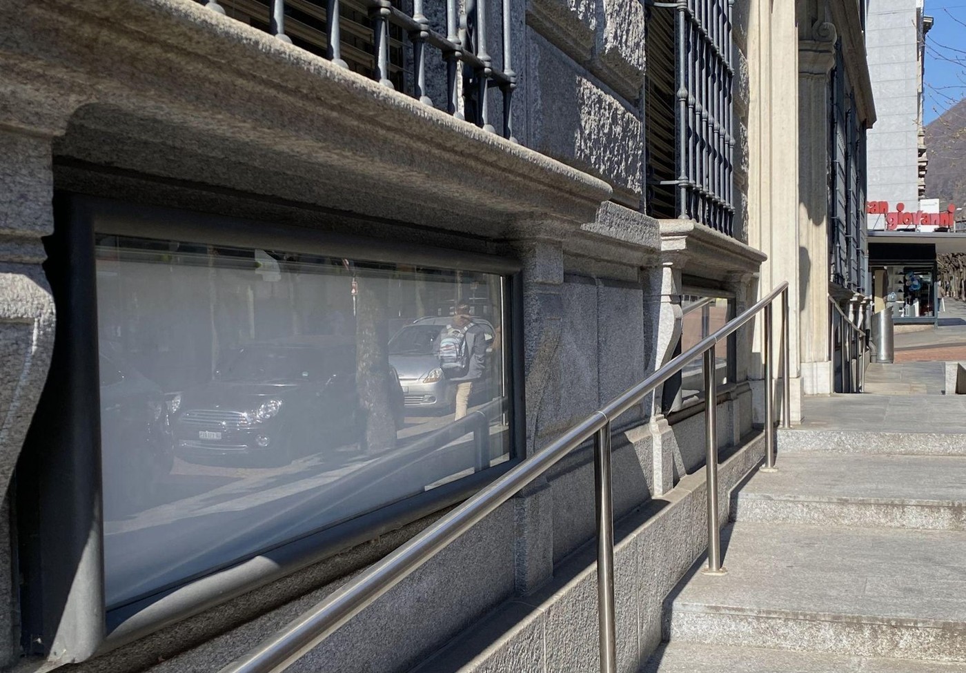 La visibilità della vetrina è parzialmente ostruita da un corrimano.
