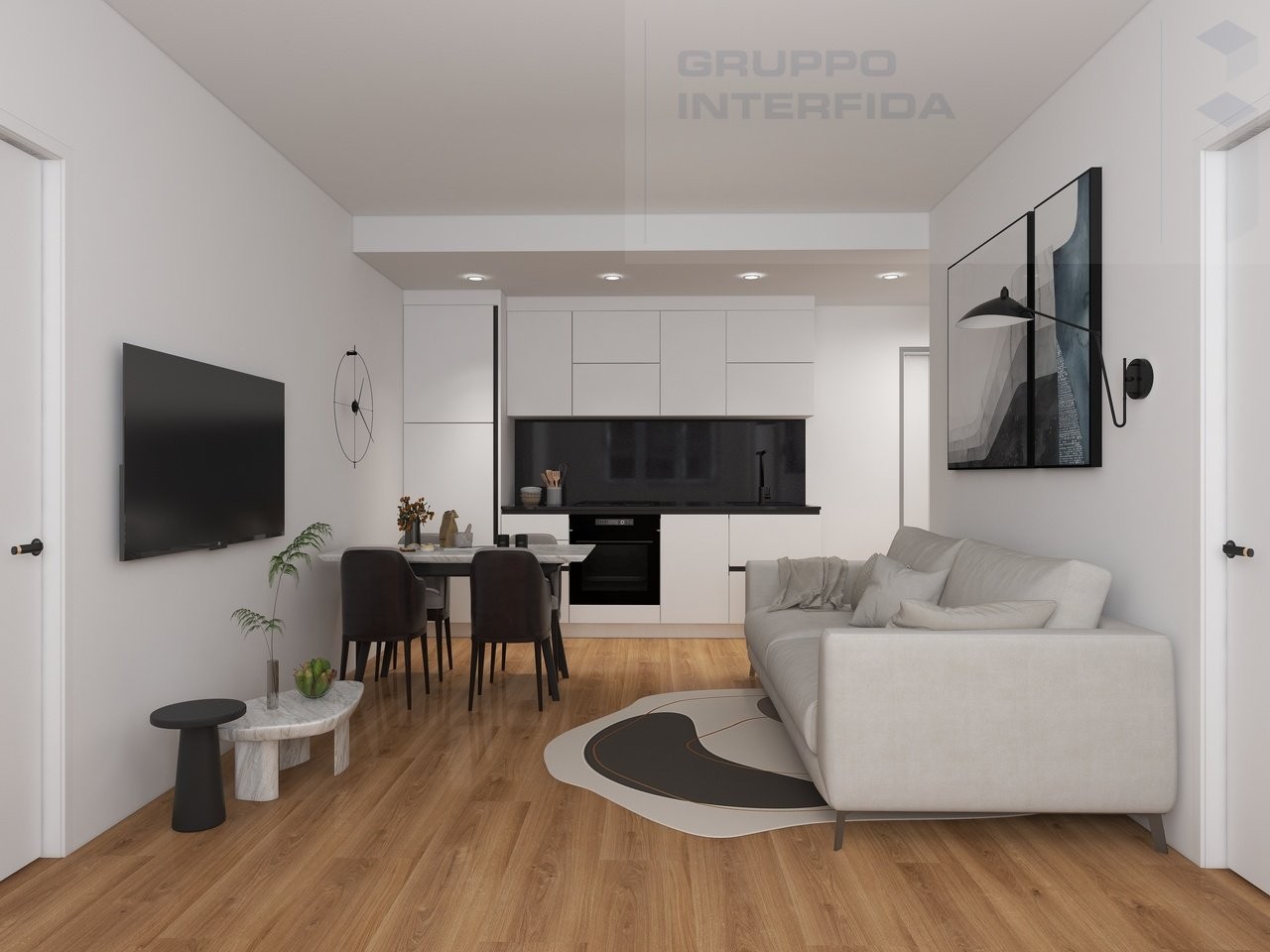 ingresso su zona giorno accogliente con cucina a vista;