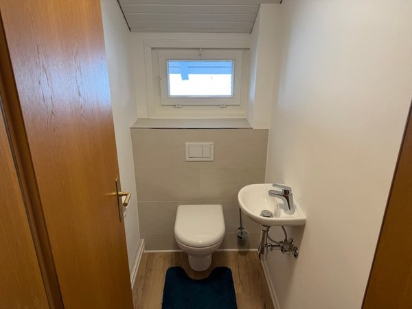 Renoviertes Badezimmer (2021) mit Badewanne, Lavabo und WC.