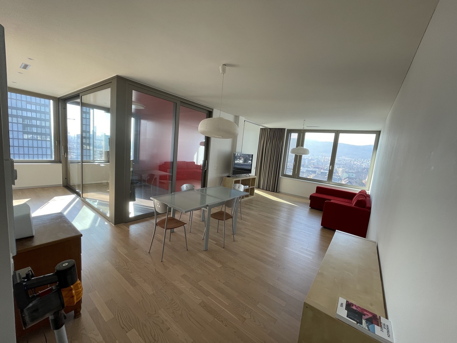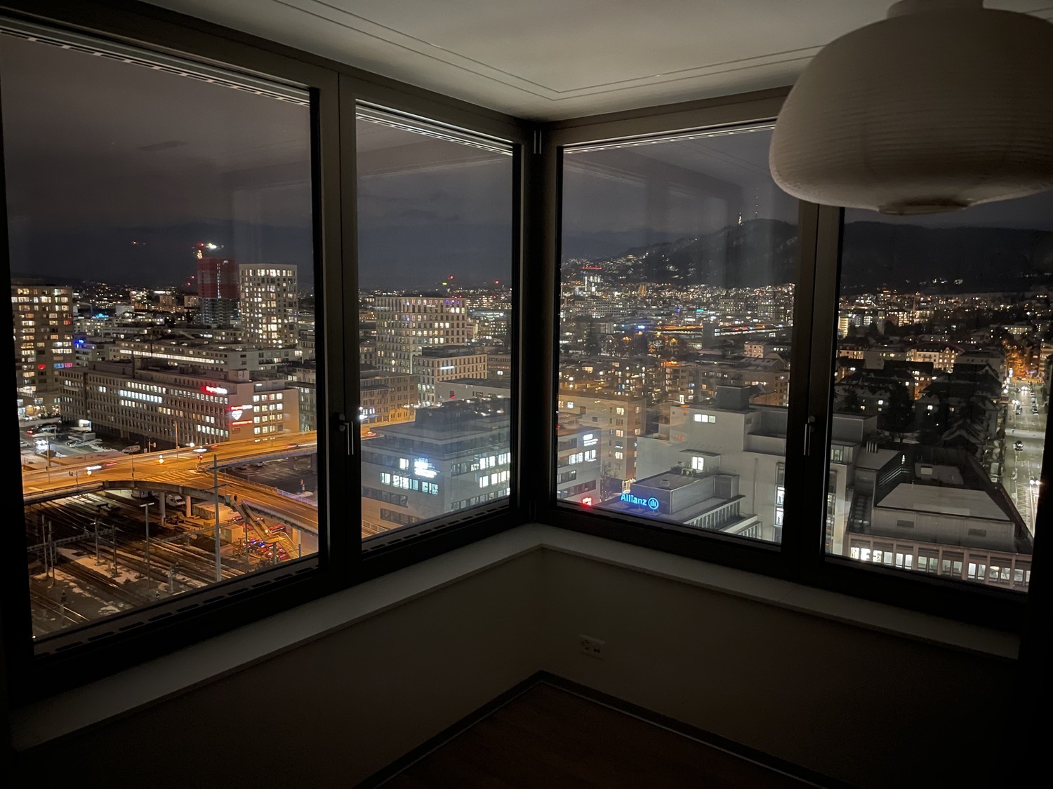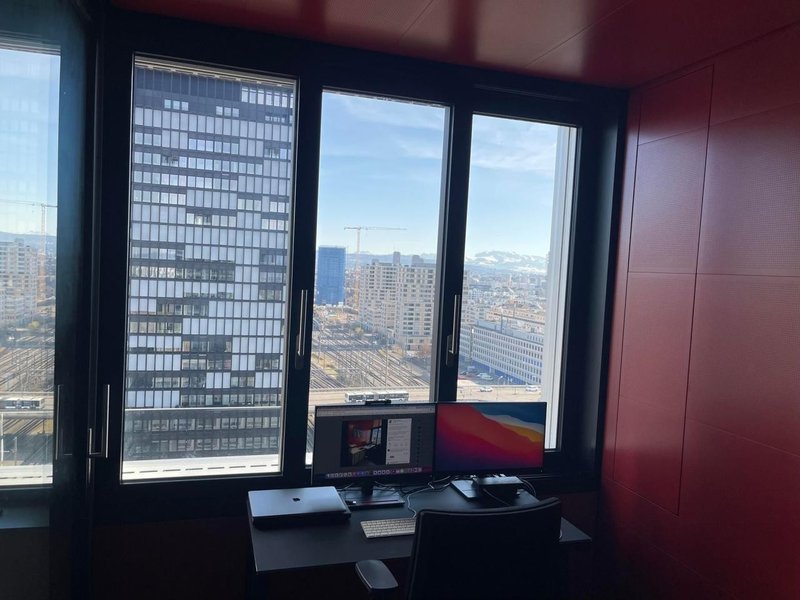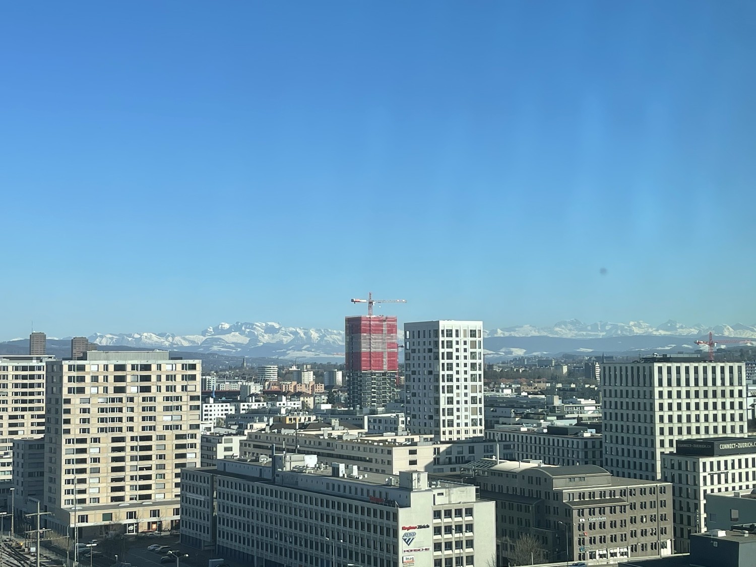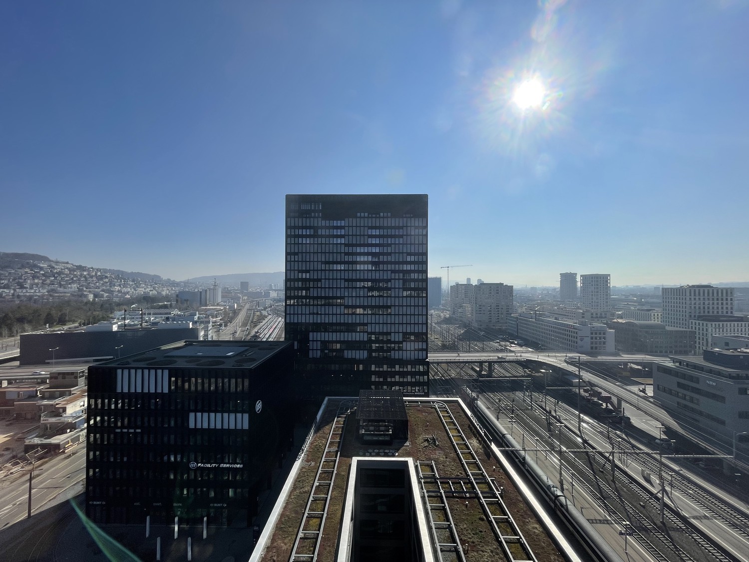 13. floor, panoramic view over City of Zurich, Uetliberg, Hönggerberg, Glarus Alps, railway field